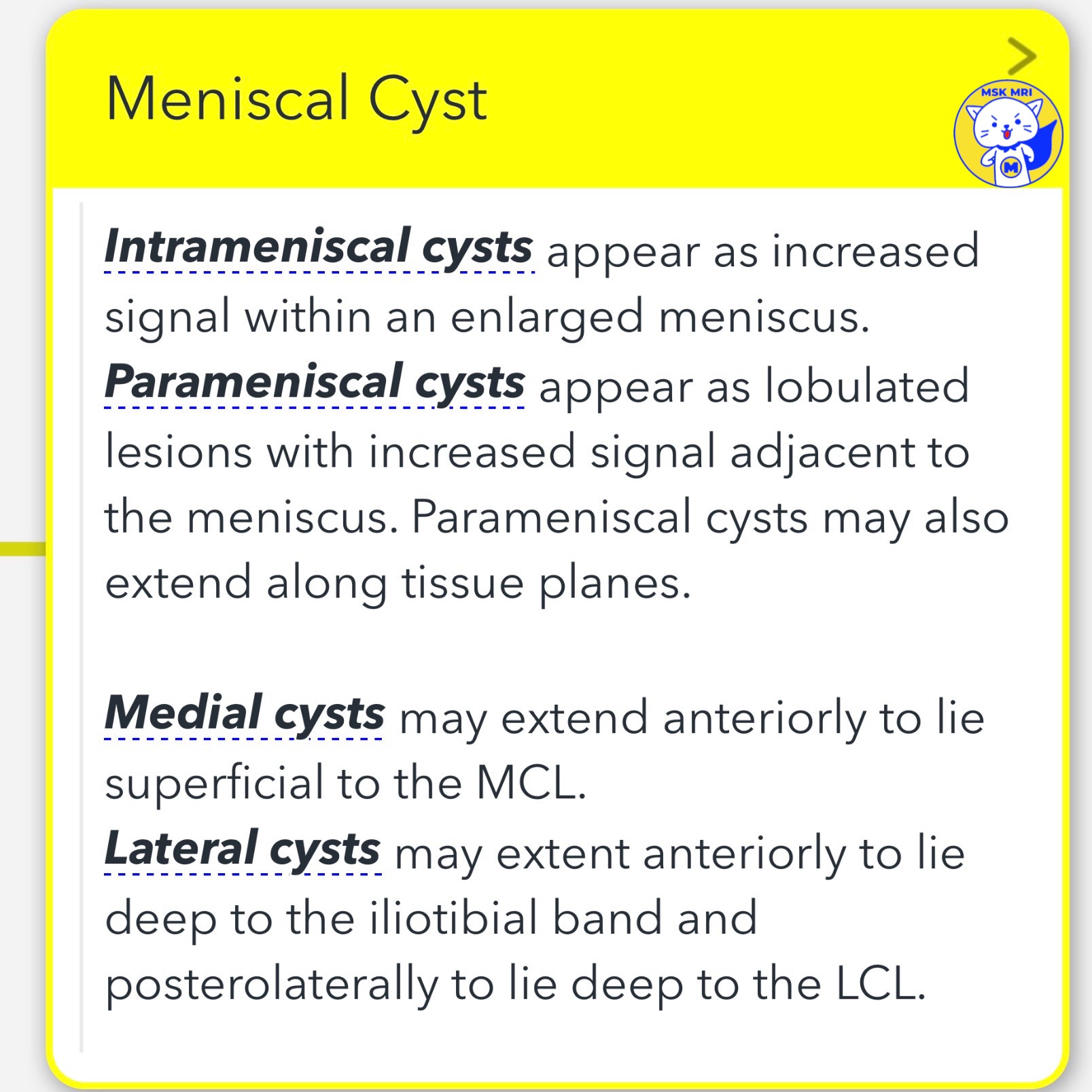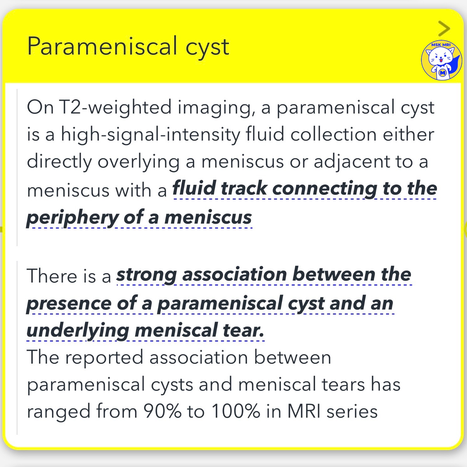 - It is defined as a high-signal-intensity fluid collection either directly overlying a meniscus or adjacent to a meniscus with a fluid track connecting to the periphery of a meniscus.