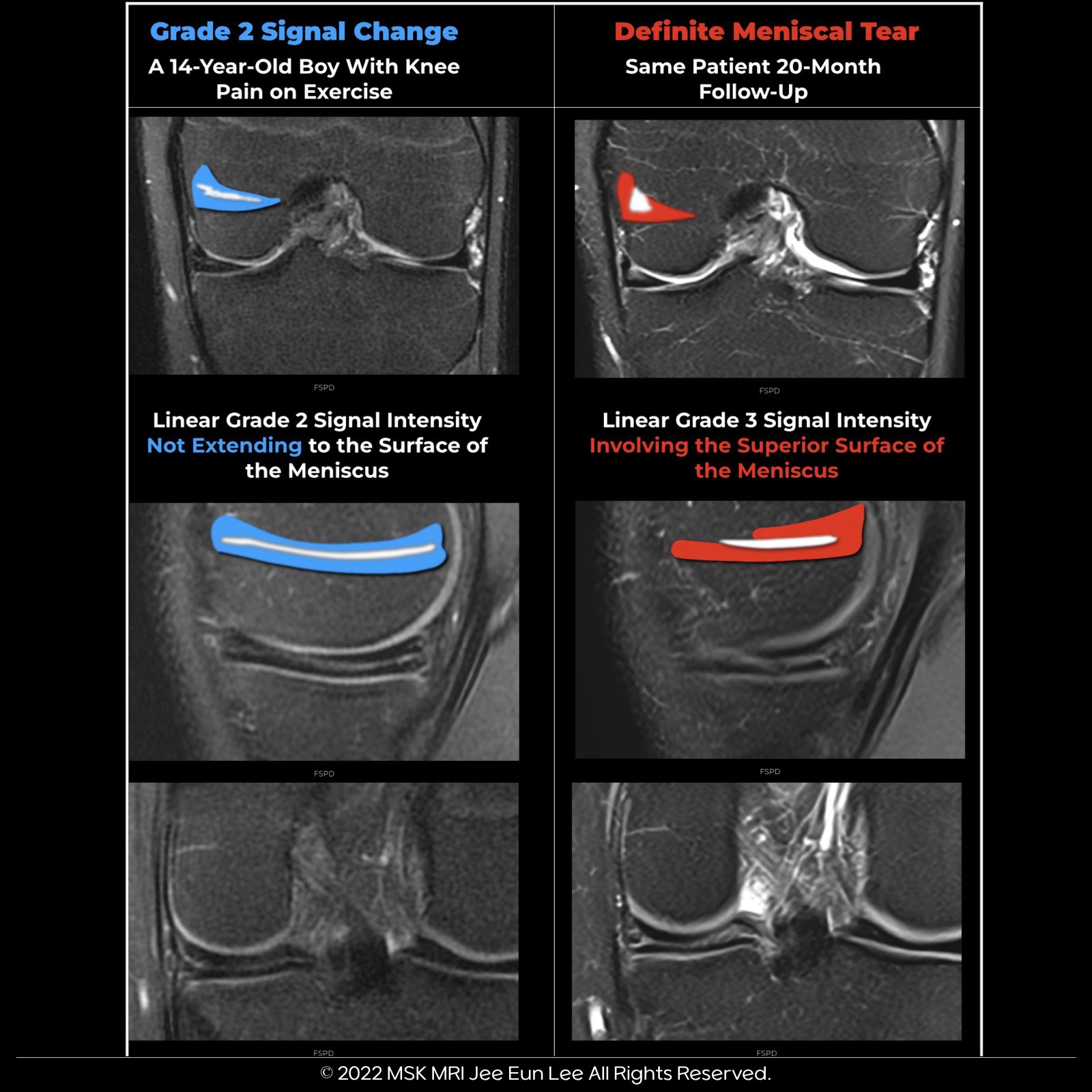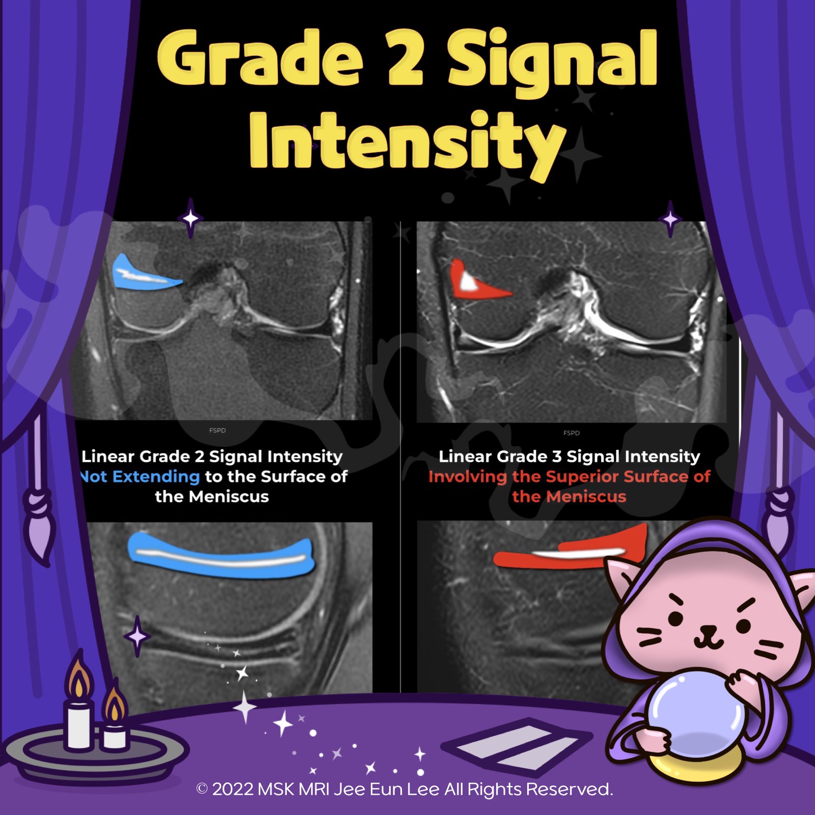 - Horizontal, linear intrasubstance signal increases from the meniscus's capsular periphery without reaching an articular surface.