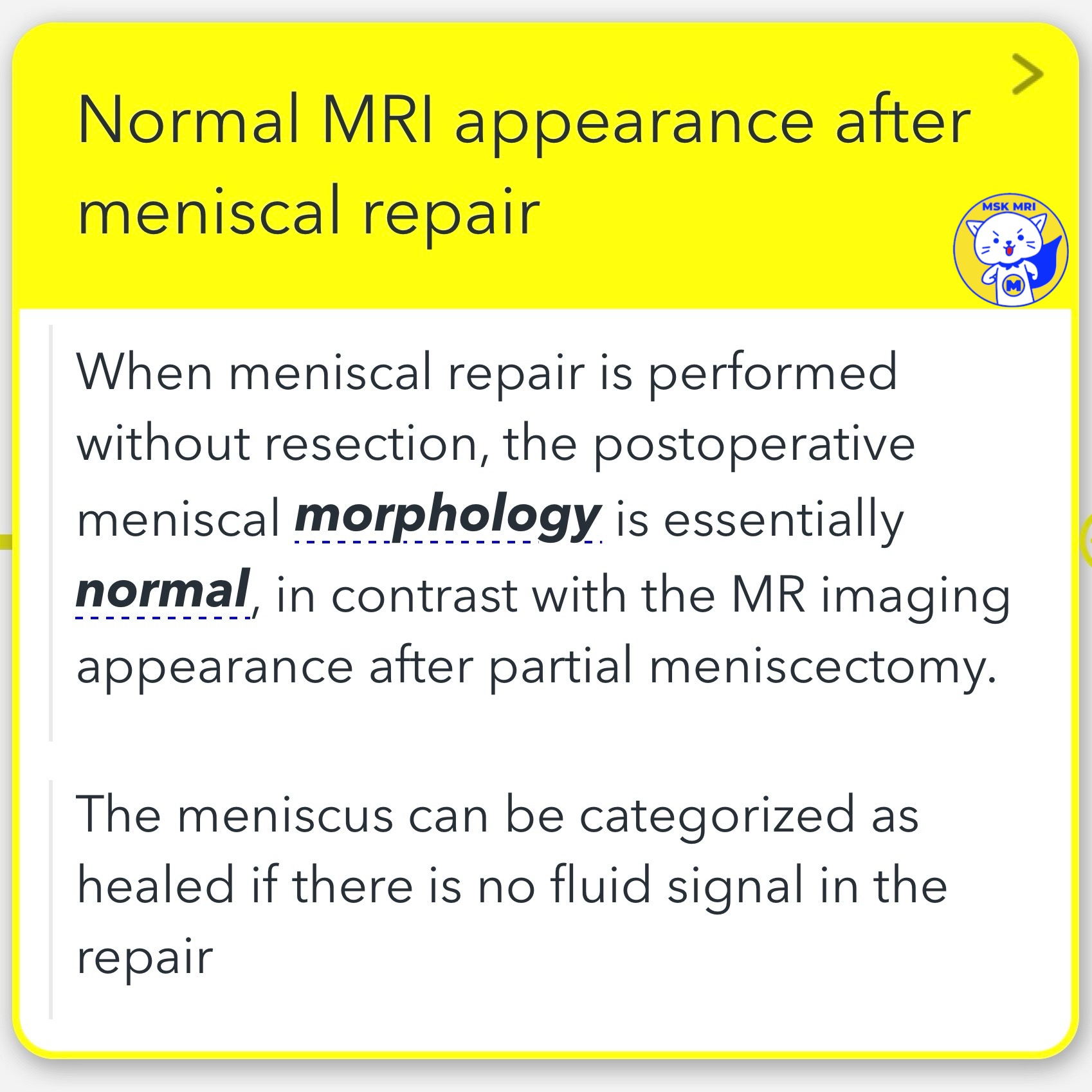 - After a meniscal repair without any resection, the postoperative morphology of the meniscus appears essentially normal on MRI, contrasting with the imaging seen after partial meniscectomy.
