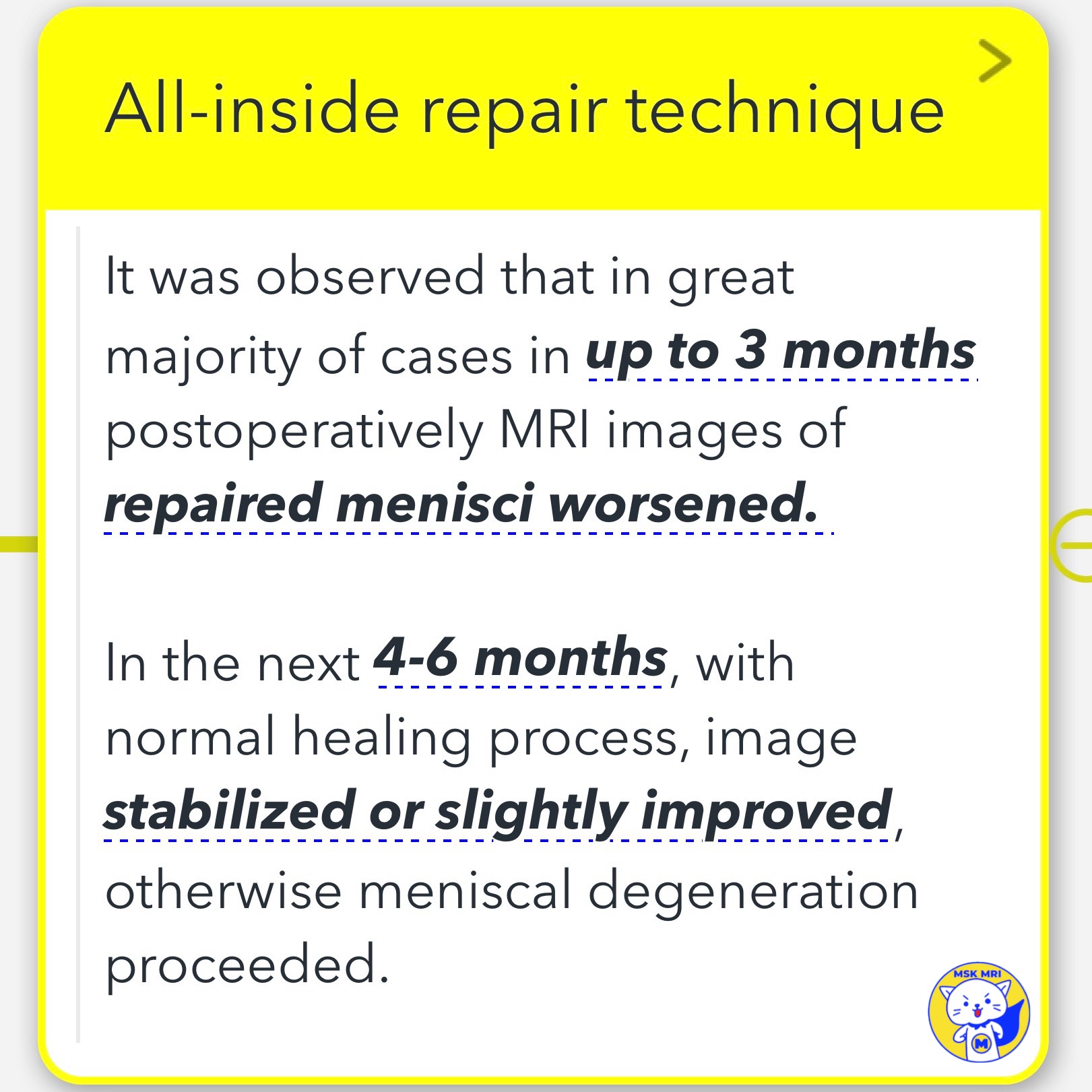 - Observations indicate that MRI images of repaired menisci typically worsen within the first 3 months post-surgery.
