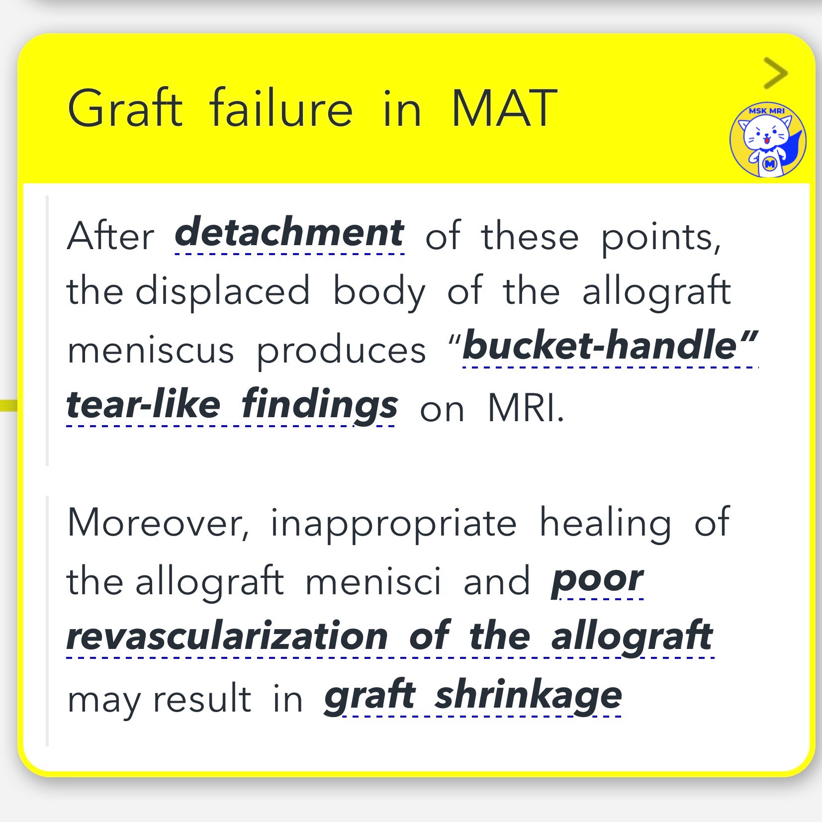 - Graft failure can manifest as displacement of the allograft meniscus body, resembling a "bucket-handle" tear on MRI scans.