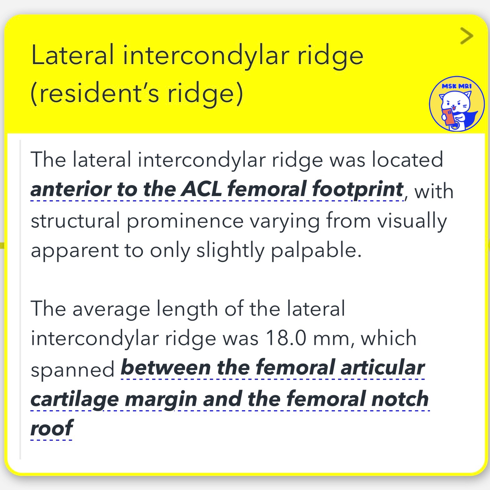 - It extends from the lateral intercondylar ridge to the posterior articular cartilage margin, with an average length of 11.6 mm.