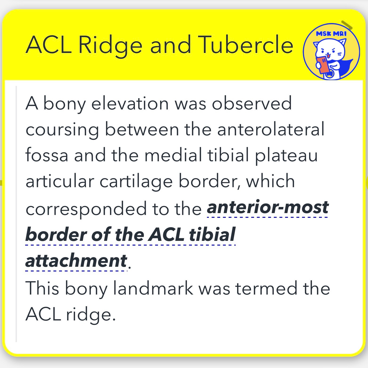 - This elevation marks the anterior-most border of the ACL tibial attachment and is termed the ACL ridge.