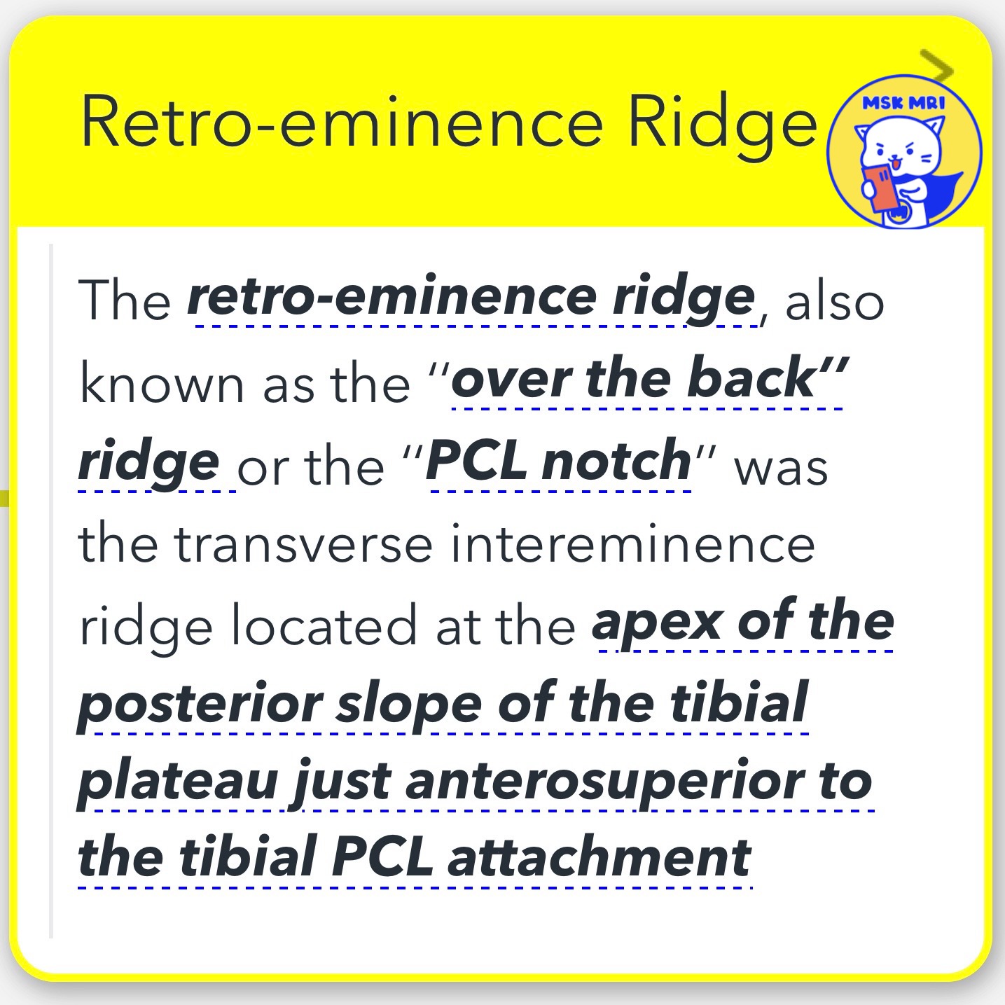 - Also known as the "over the back" ridge or the "PCL notch," this transverse intereminence ridge is found at the apex of the posterior slope of the tibial plateau, just anterosuperior to the tibial PCL attachment.