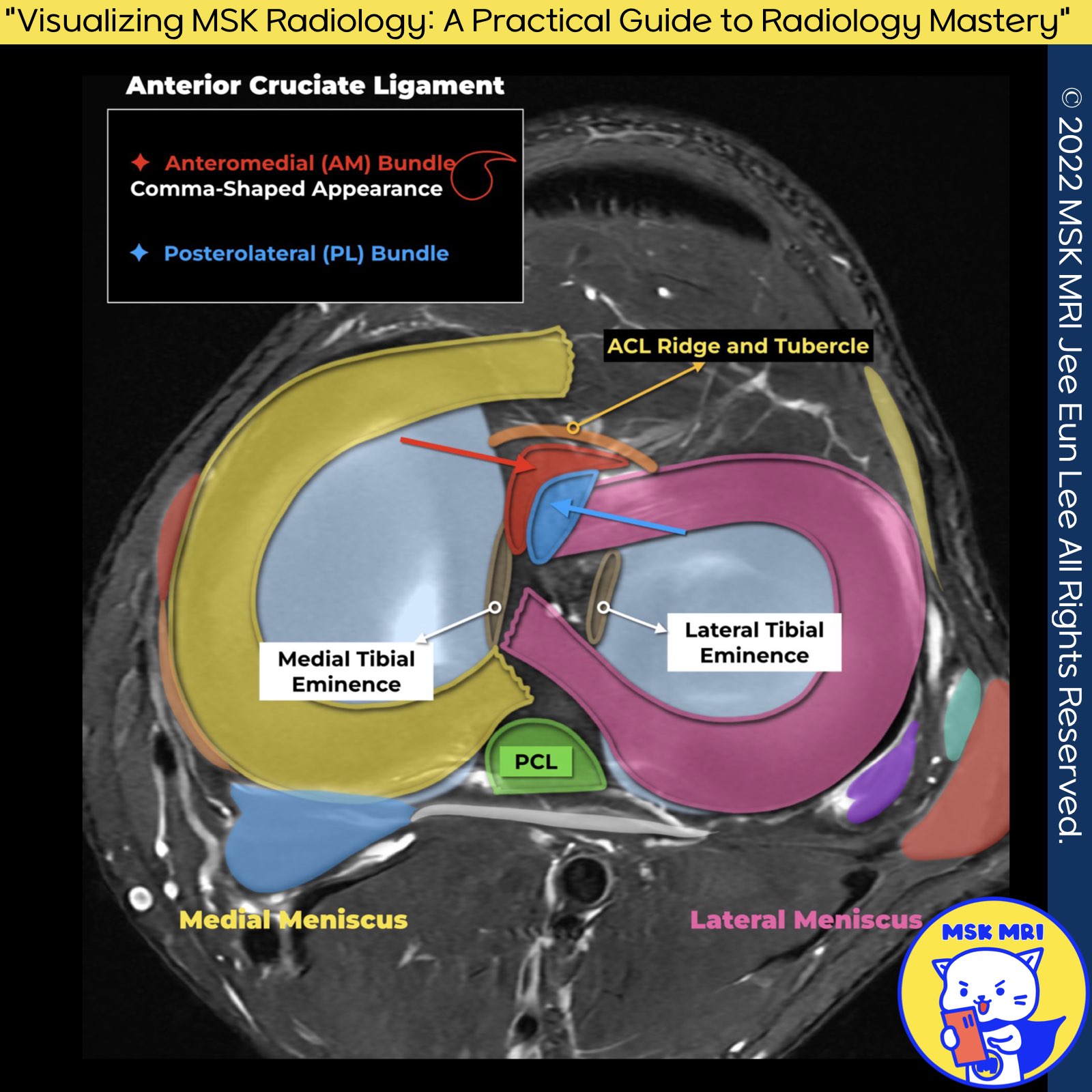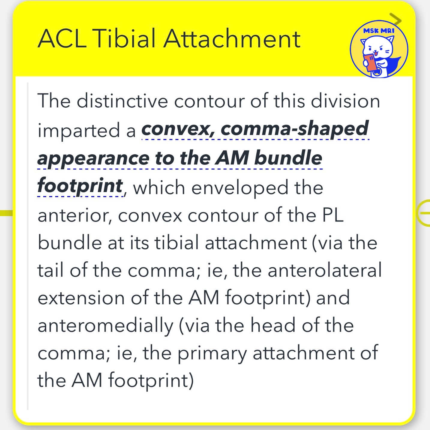 - The ACL's Anteromedial (AM) bundle footprint presents a convex, comma-shaped appearance at the tibial attachment. This shape encompasses the anterior, convex contour of the Posterolateral (PL) bundle, connecting anterolaterally (via the tail of the comma) and anteromedially (via the head of the comma).