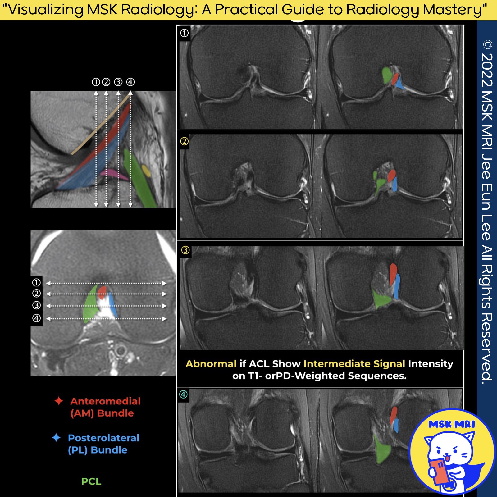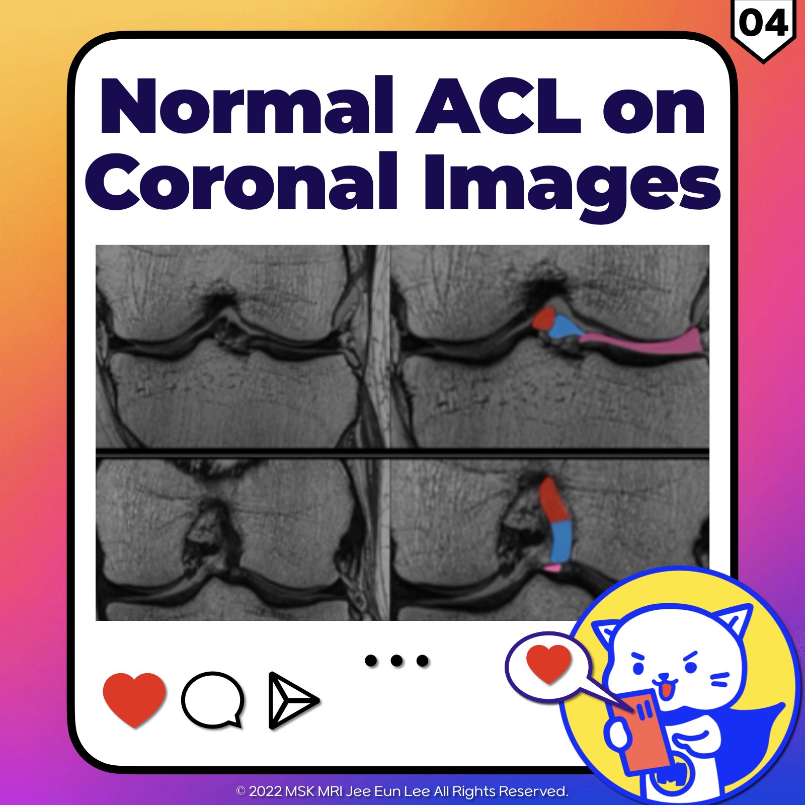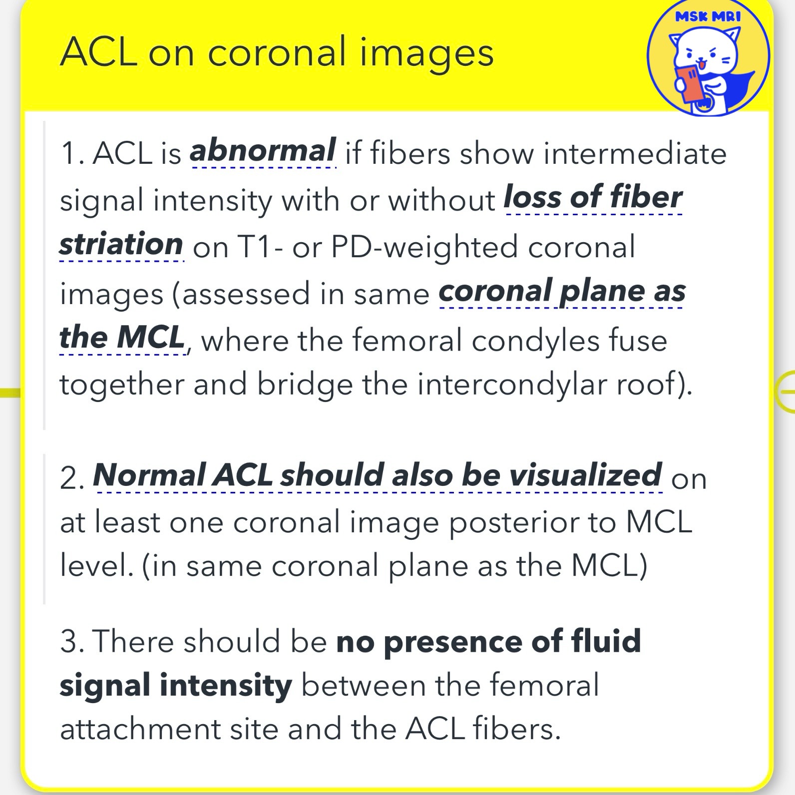A normal ACL should be identifiable on at least one coronal image posterior to the MCL level, aligning with the same coronal plane as the MCL.