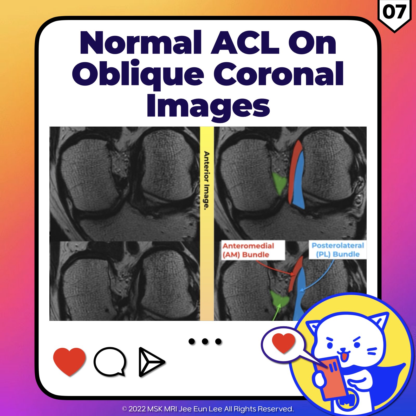 Oblique coronal imaging techniques, specifically tailored to align with the longitudinal axis of the Anterior Cruciate Ligament (ACL) or the roof of the intercondylar notch, play a crucial role in the depiction of the different components of the ACL and allow for complete visualization of the ACL.