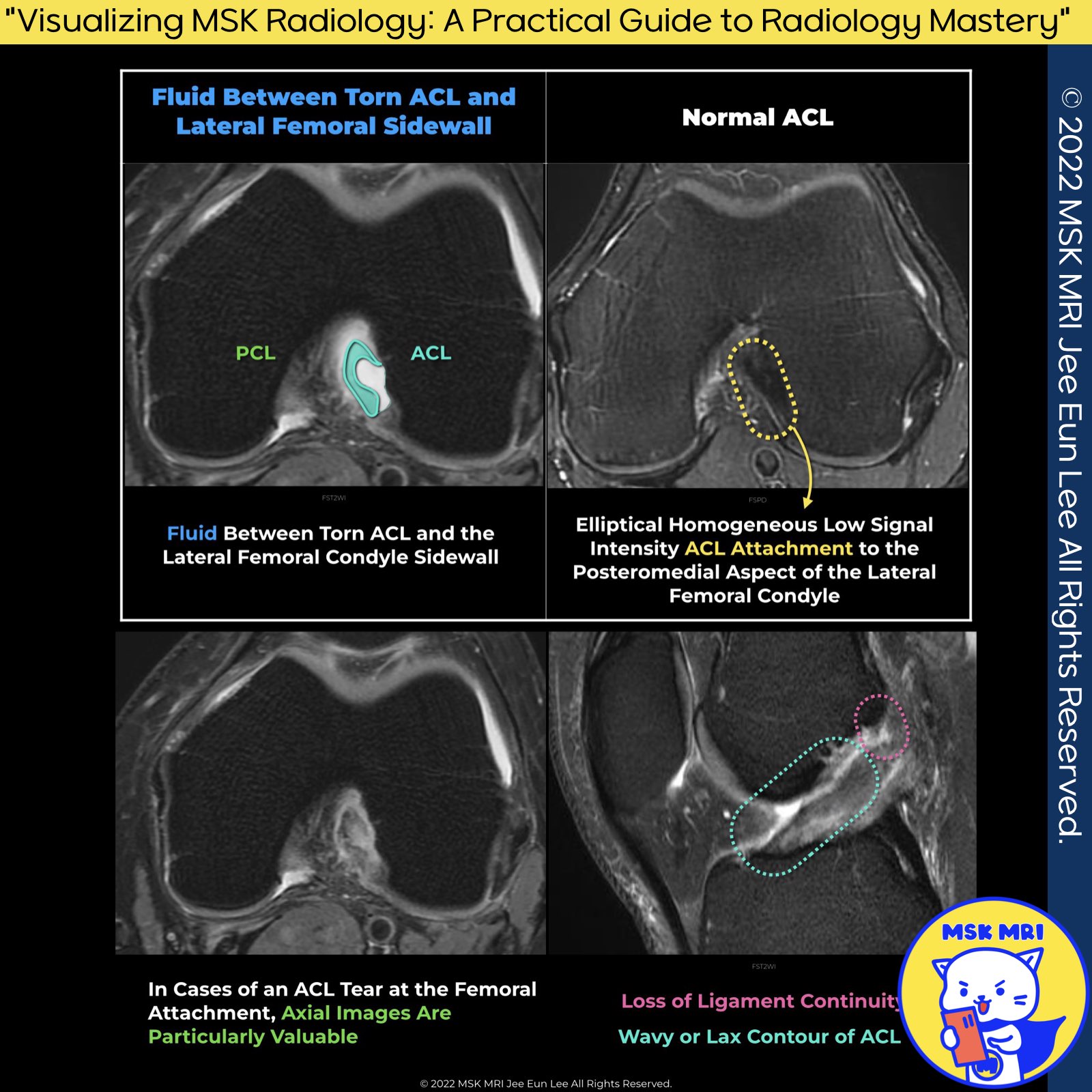 - In cases of an ACL tear at the femoral attachment, axial images are particularly valuable for increased signal intensity within the proximal ACL fibers or the presence of fluid between the torn ACL and the lateral femoral condyle sidewall.