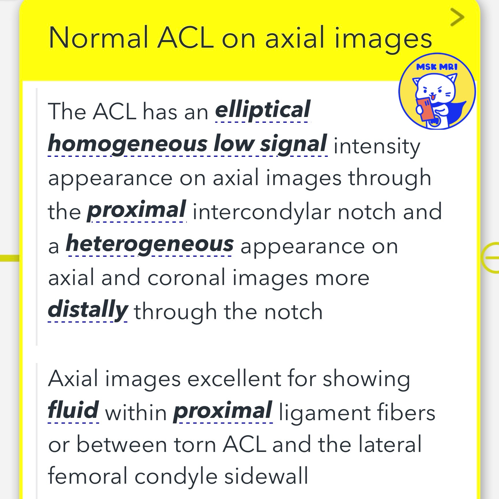 - The normal ACL has an elliptical homogeneous low signal intensity appearance on axial images through the proximal intercondylar notch.
