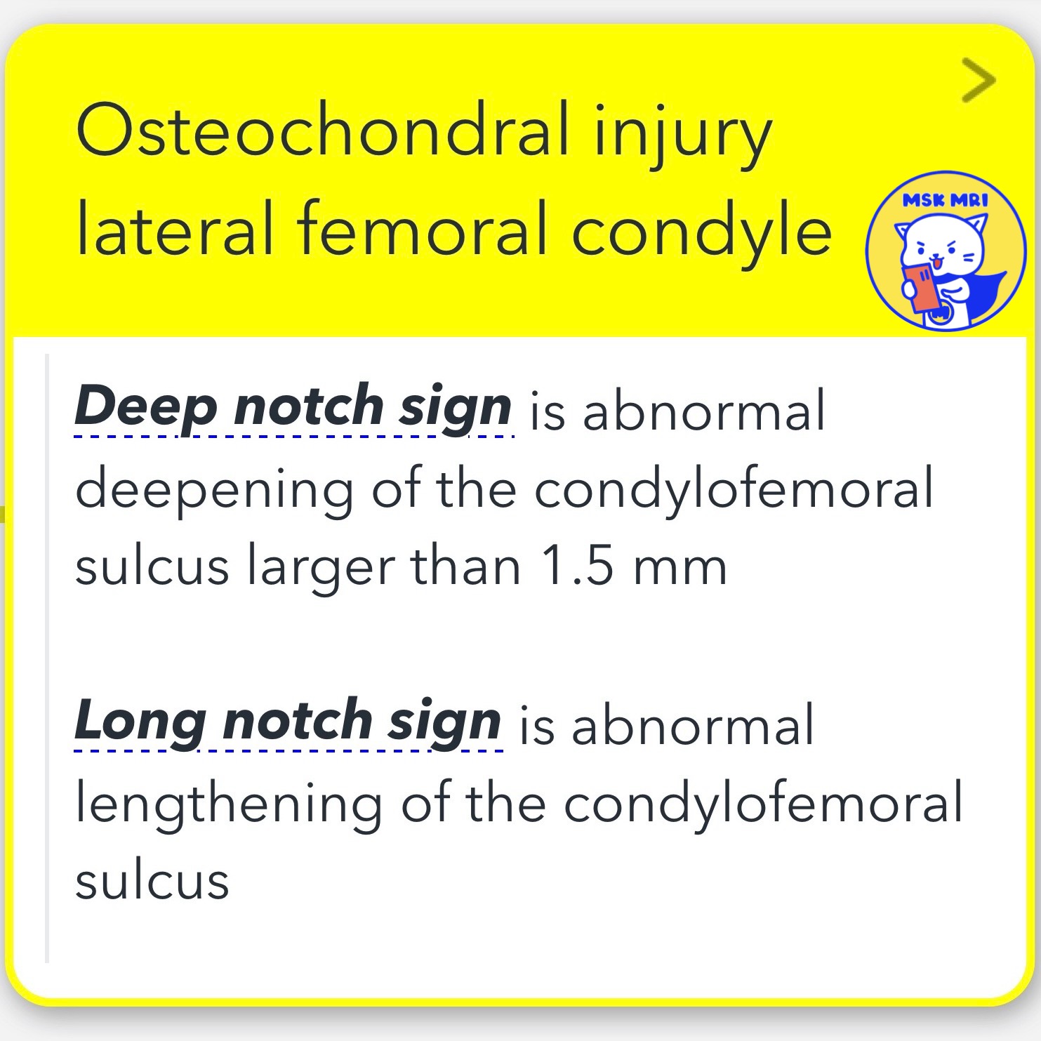 This sign is defined by an abnormal deepening of the condylofemoral sulcus by more than 1.5 mm (or 2 mm). It suggests an osteochondral fracture in the lateral femoral condyle.