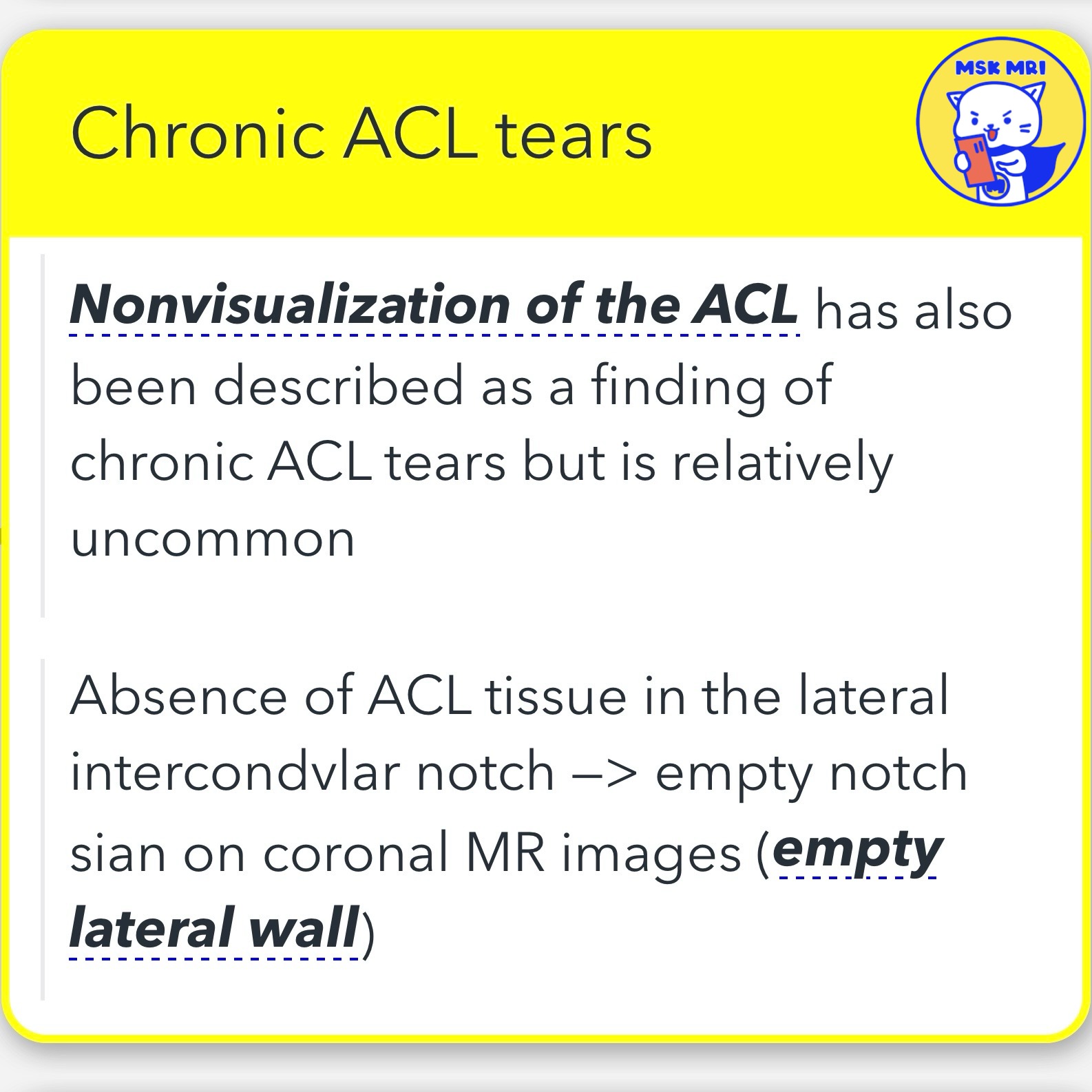 - Nonvisualization of the ACL has also been described as a finding of chronic ACL tears but is relatively uncommon.
