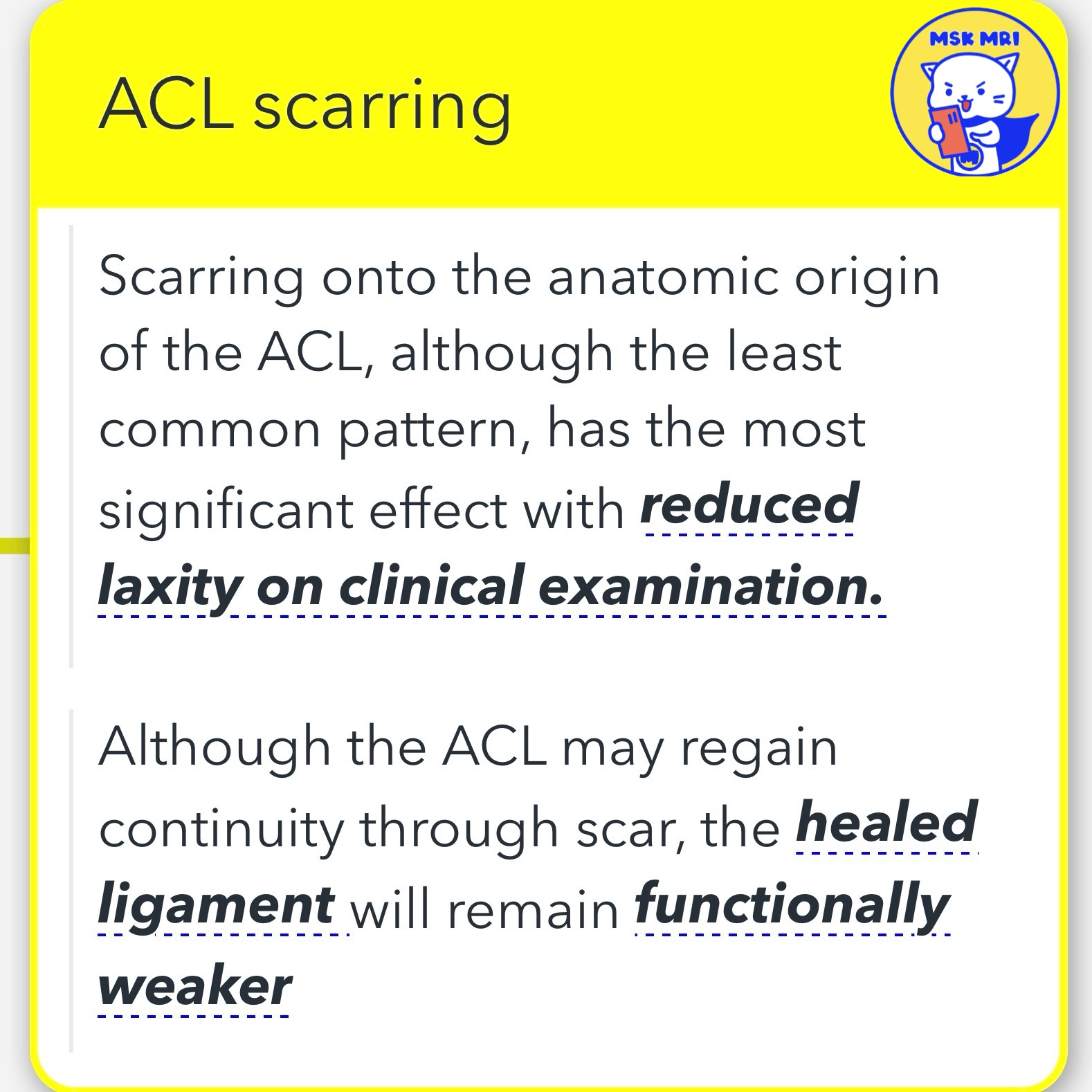 - Among these patterns, scarring that reconnects the ACL to its original attachment point is rare but results in the most significant improvement, leading to reduced laxity (looseness) during clinical examinations.