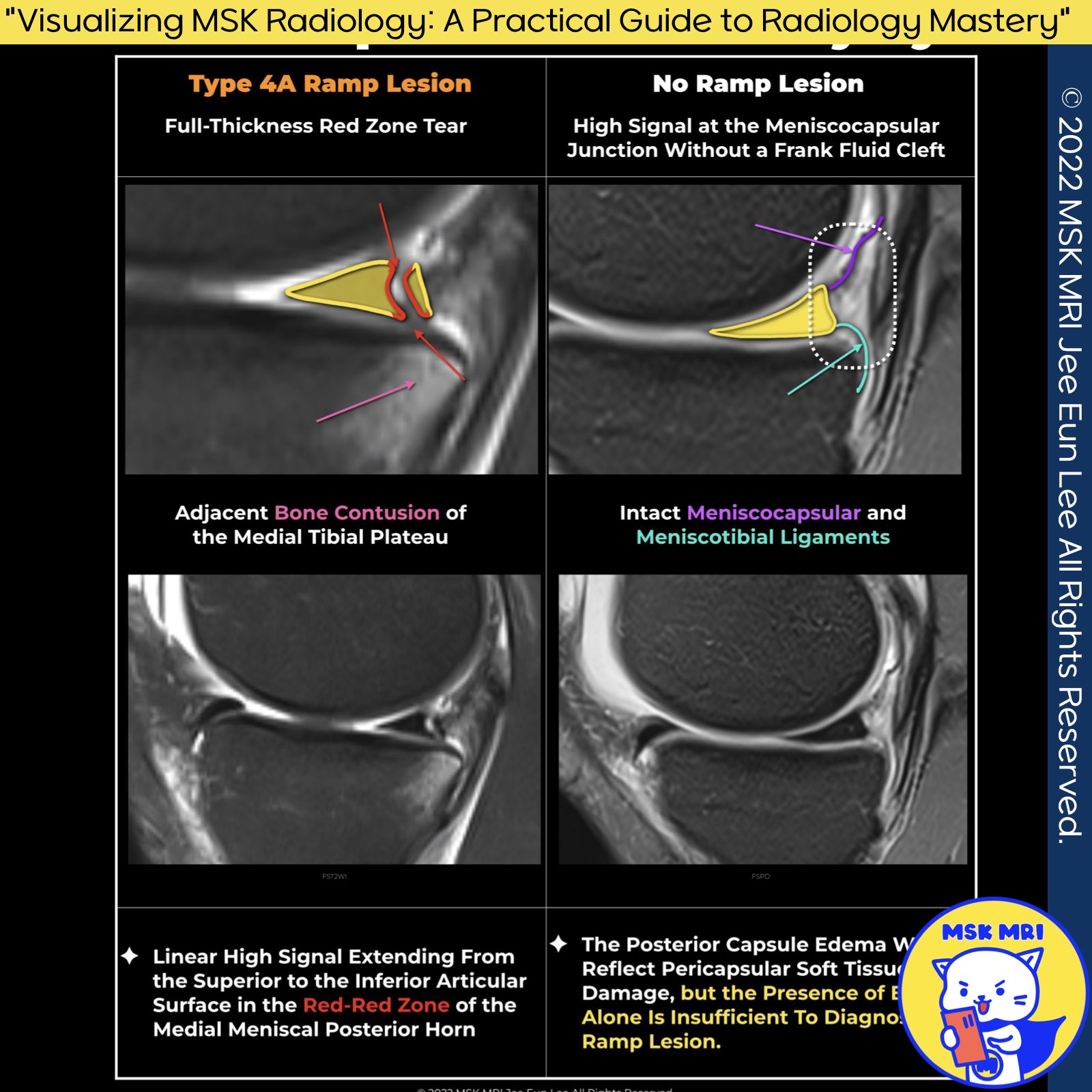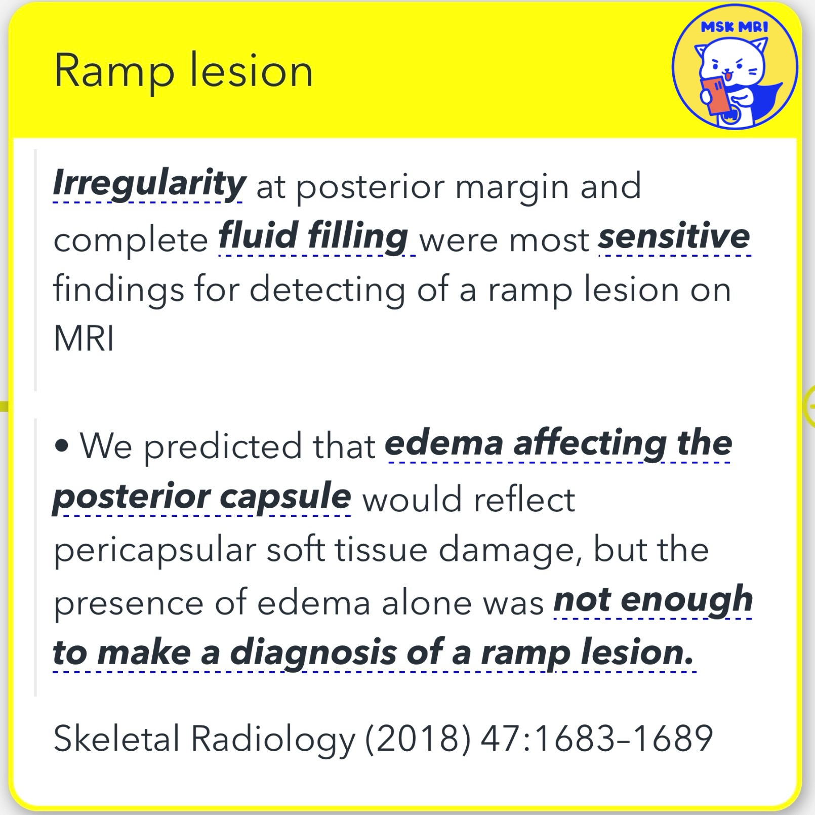 - Edema affecting the posterior capsule reflects pericapsular soft tissue damage; however, edema alone is insufficient for diagnosing a ramp lesion.