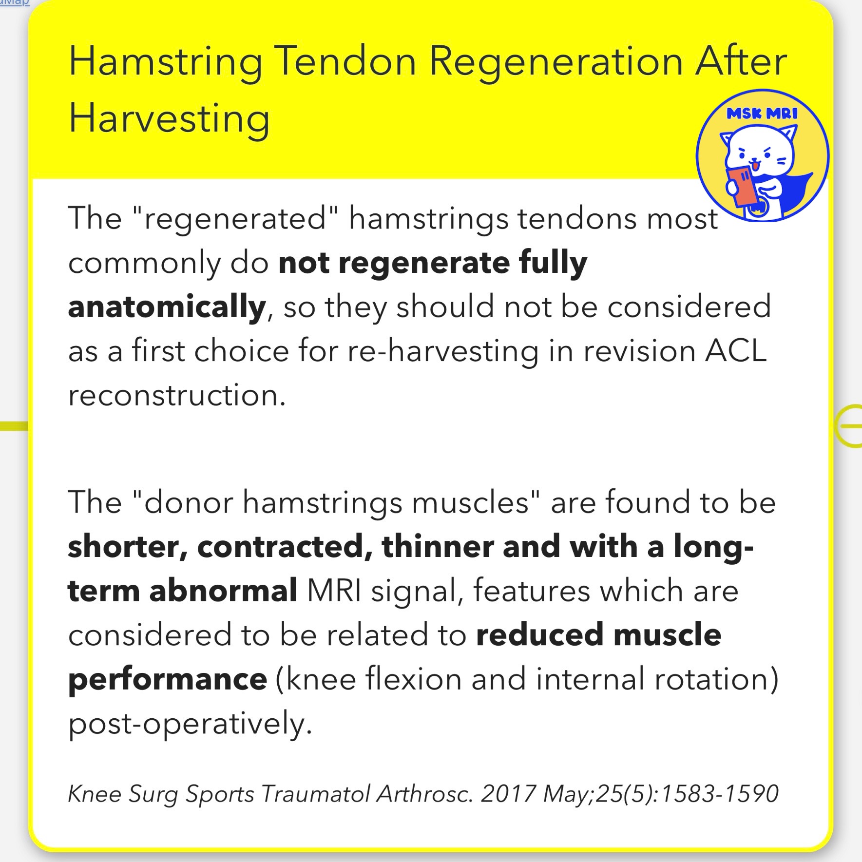 - Regenerated hamstring tendons often lack full anatomical restoration, making them less ideal for re-harvesting in revision ACL reconstruction.