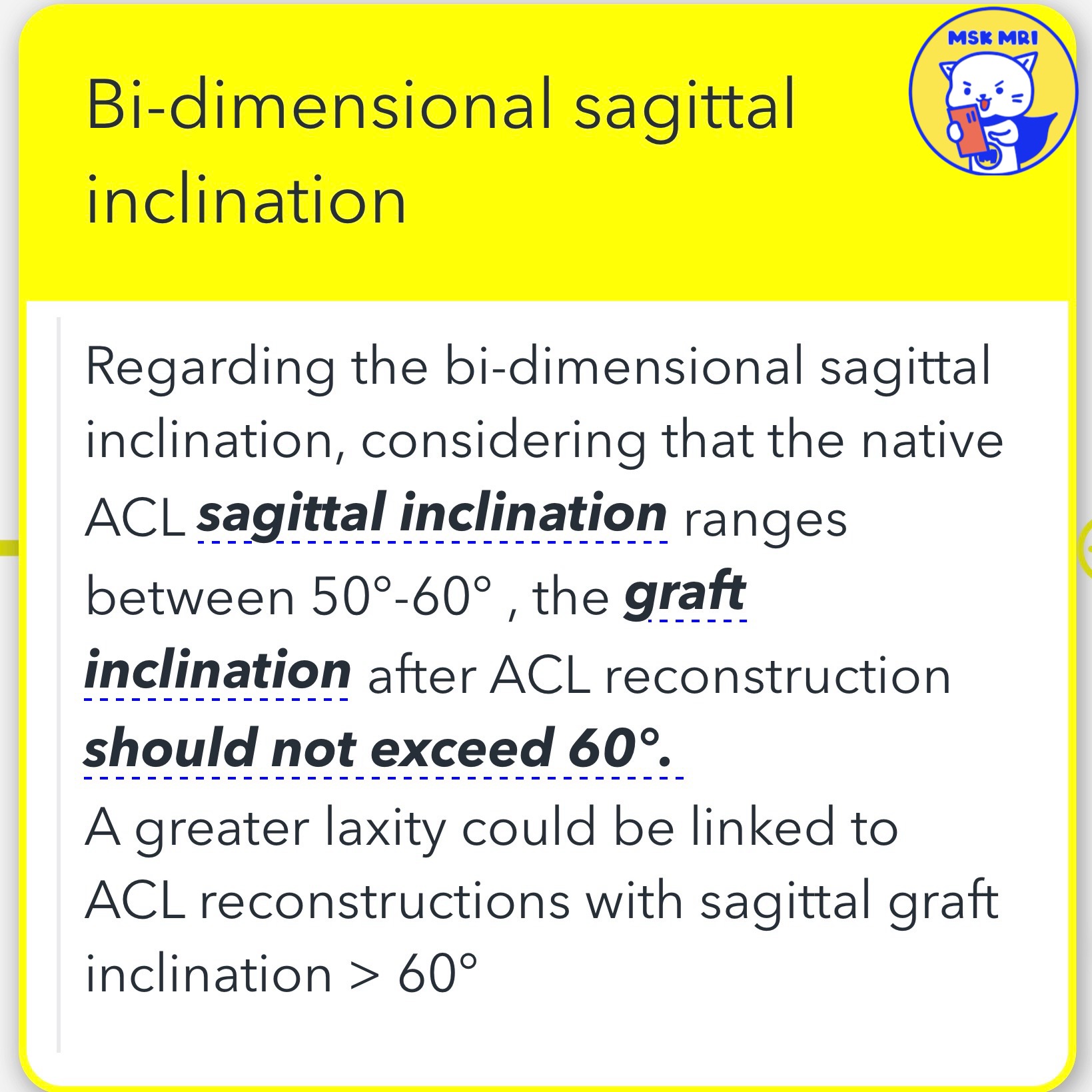 - It is advised that the graft inclination after ACL reconstruction should not exceed 60° to maintain the natural mechanics of the knee joint.