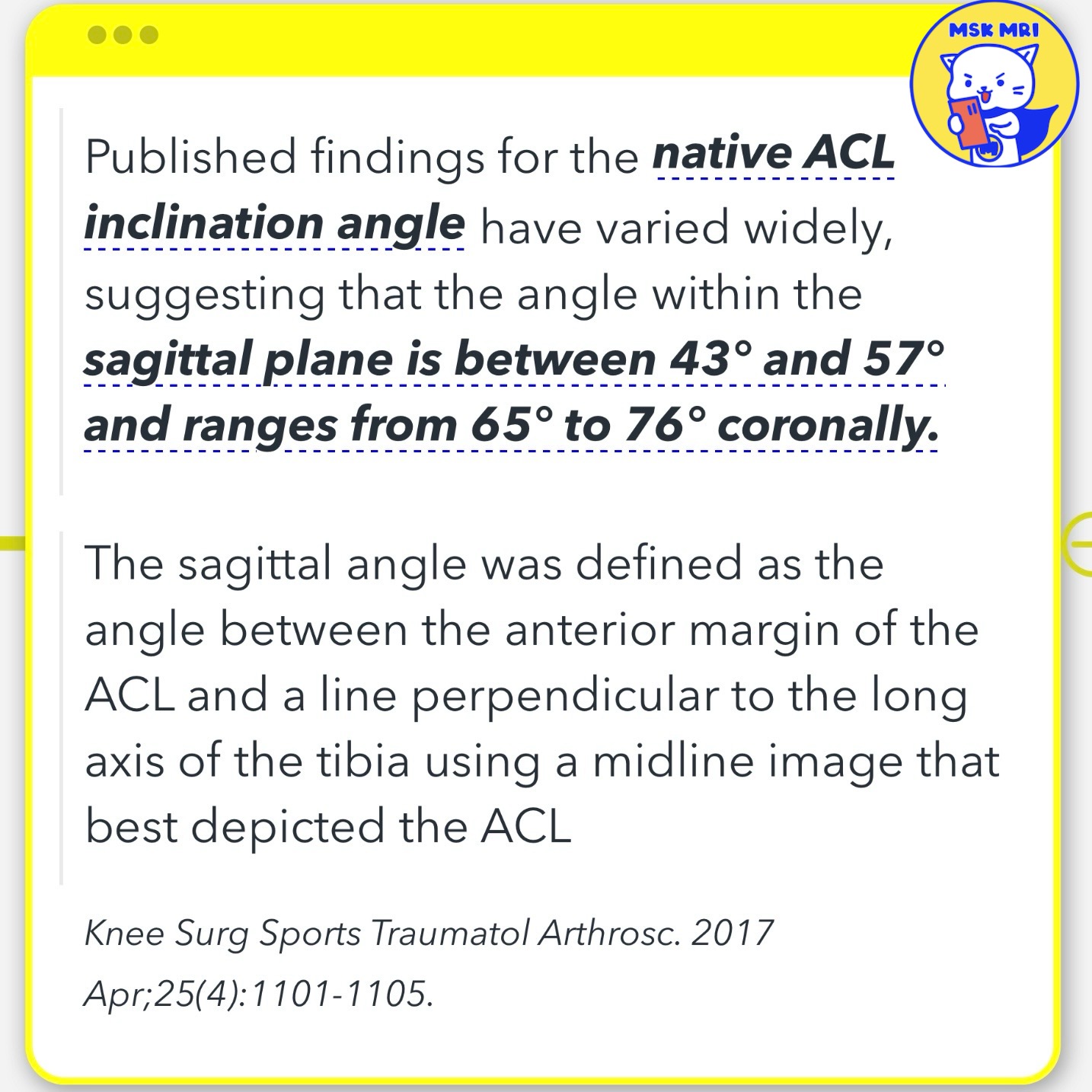 - Research indicates that the native ACL sagittal inclination ranges between 50°-60°.