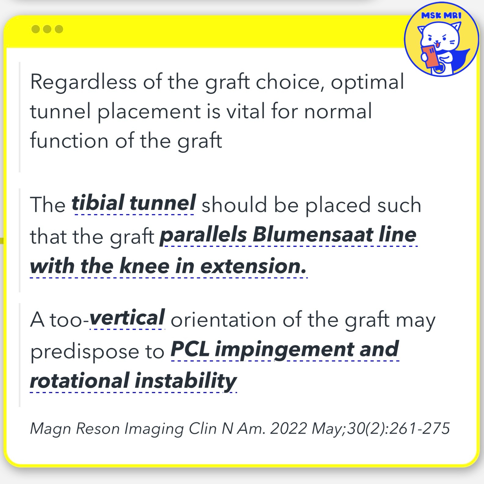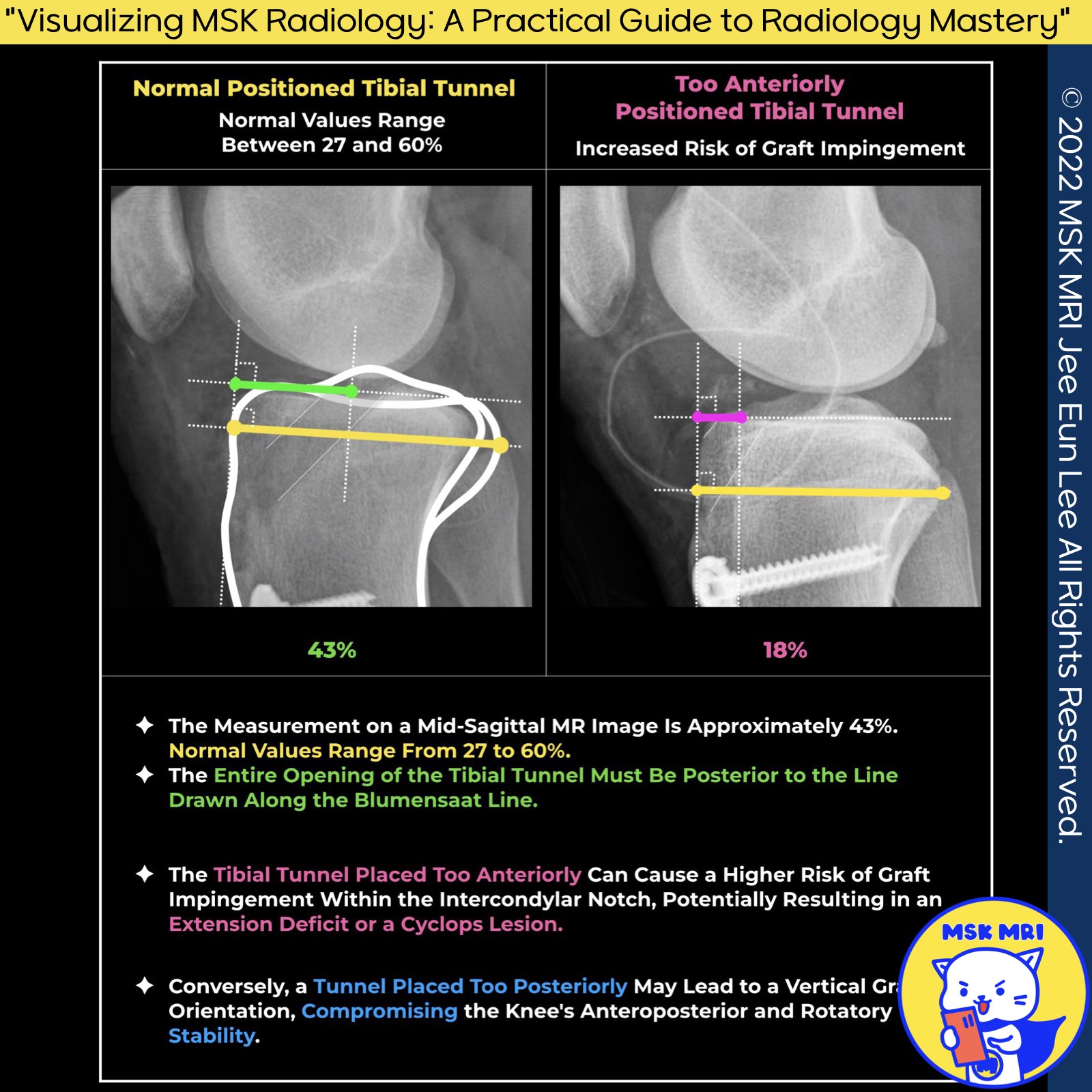 "Visualizing MSK Radiology: A Practical Guide to Radiology Mastery" © 2022 MSK MRI Jee Eun Lee All Rights Reserved. #VisualizingMSK #ACLinjuries #KneeMRI #ACLtear #ACLreconstruction #tibialtunnel You may not distribute or commercially exploit the content. Nor may you transmit it or store it on any other website or other forms of the electronic retrieval system.