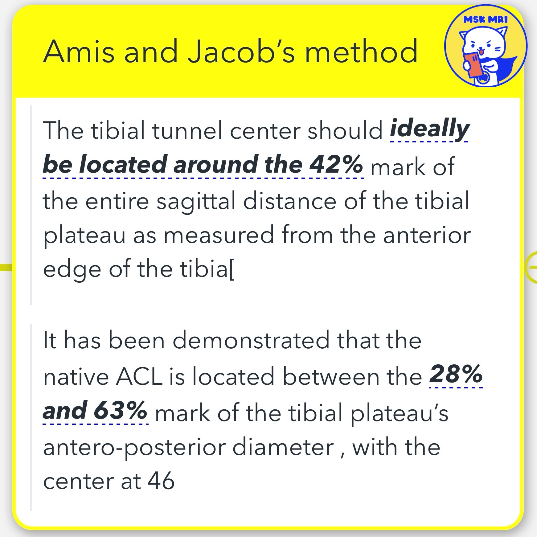 - This method involves a percentage-term measurement generated from the Amis and Jakob’s line intersecting the anterior border (0%) and posterior border (100%) of the tibia plateau.