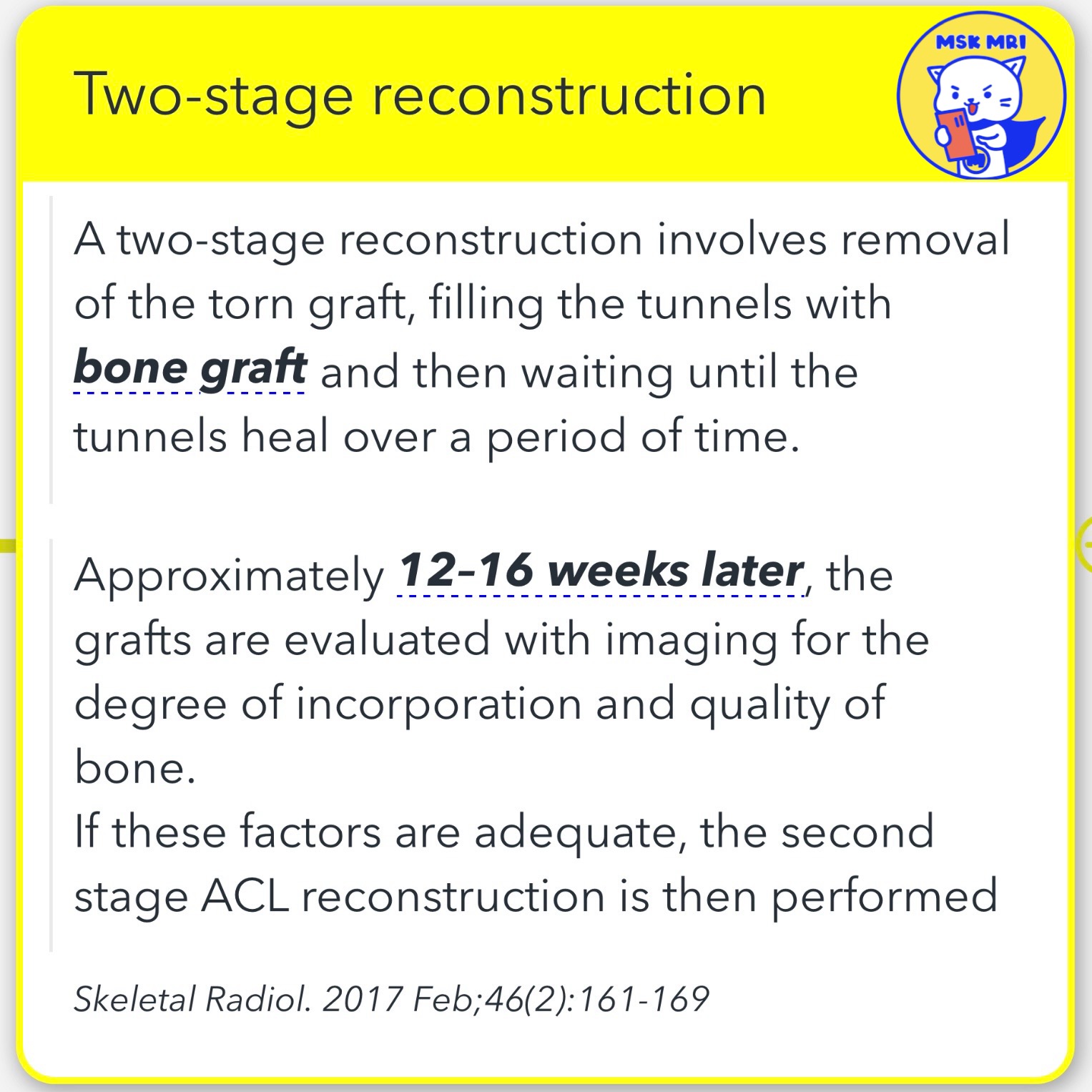 A two-stage reconstruction involves removing the torn graft and filling the tunnels with bone graft. - This is then left to heal over some time, typically 12–16 weeks.