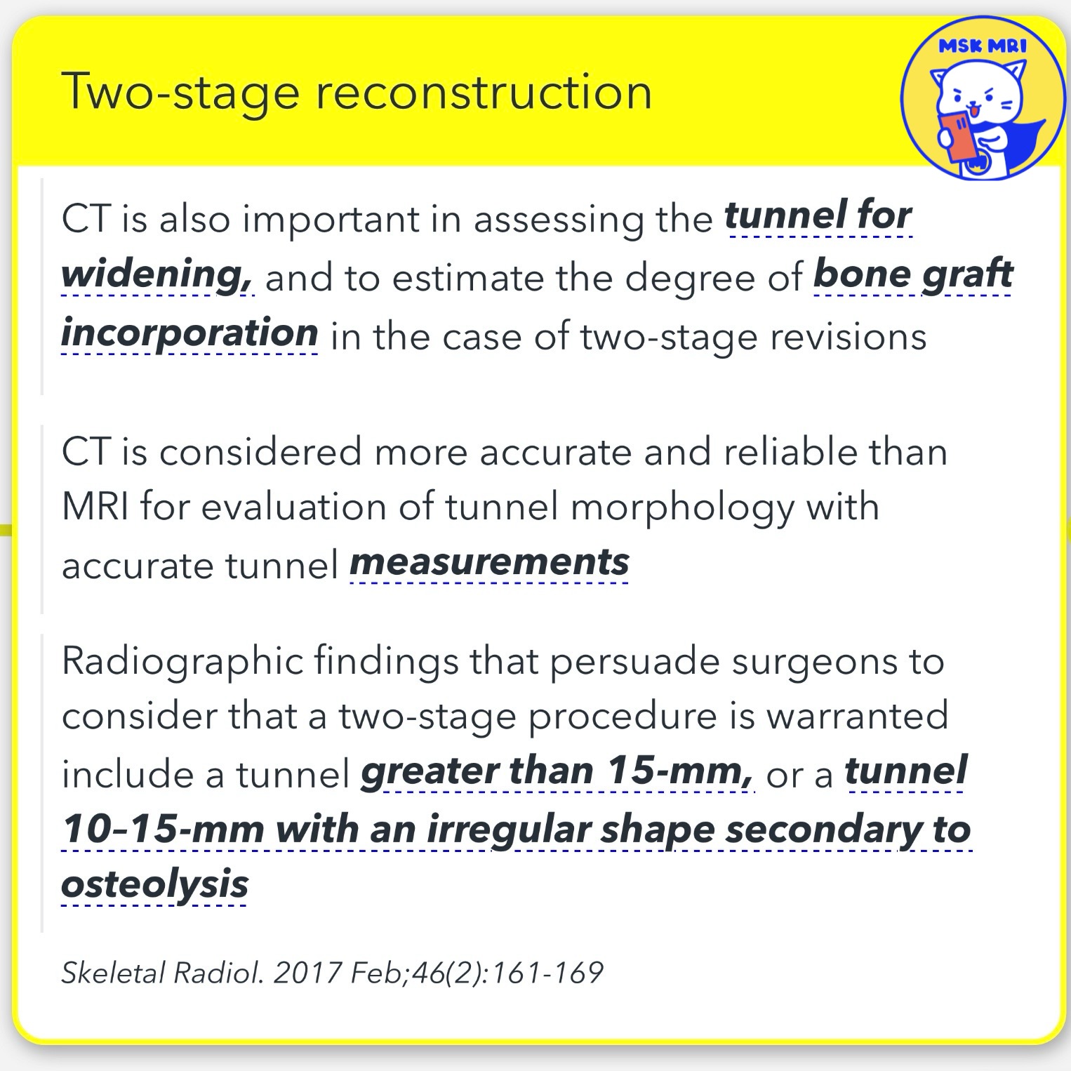 - CT scans play a crucial role in assessing the tunnel for widening and estimating the degree of bone graft incorporation in cases of two-stage revisions.