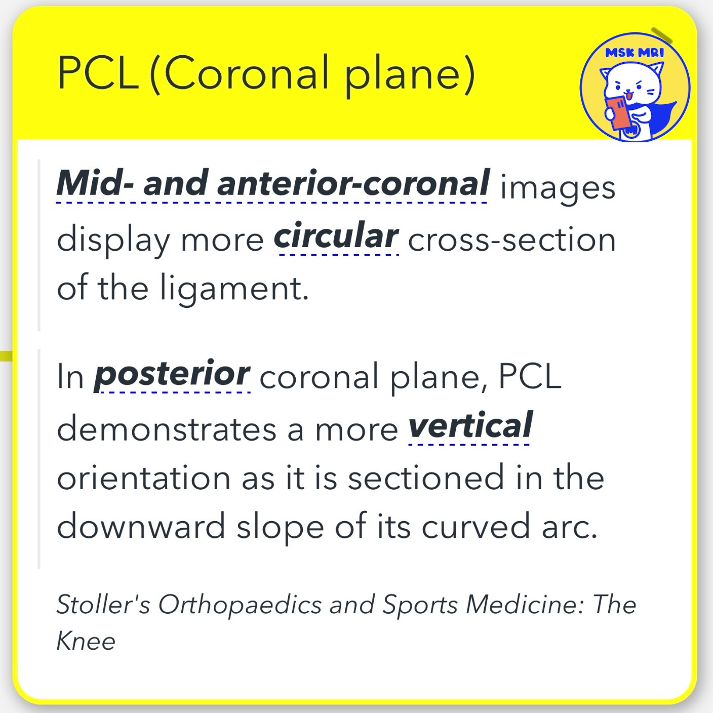- On the posterior coronal plane, the PCL shows a more vertical orientation. This is because it's sectioned along the downward slope of its curved arc.