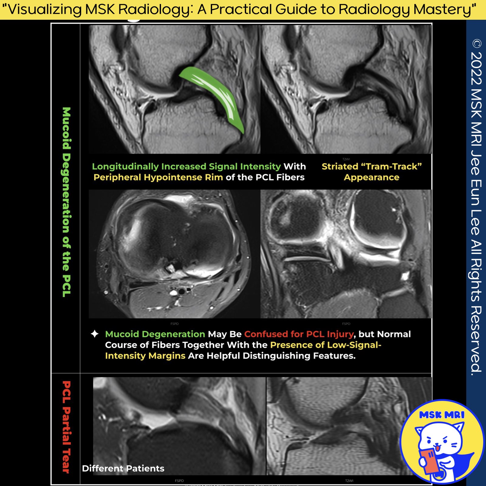 "Visualizing MSK Radiology: A Practical Guide to Radiology Mastery" © 2022 MSK MRI Jee Eun Lee All Rights Reserved. #VisualizingMSK #KneeMRI #PCLinjury #PCLtear #ACLinjury #mucoid #tramtrack You should not distribute or commercially exploit the content. You should not transmit or store it on any other website or electronic retrieval system.
