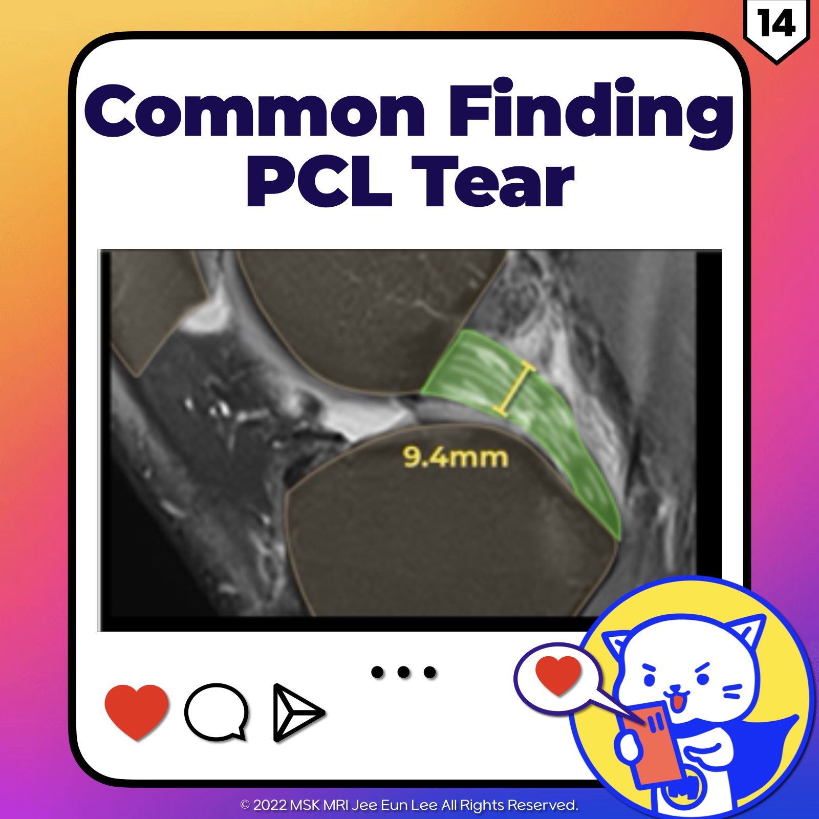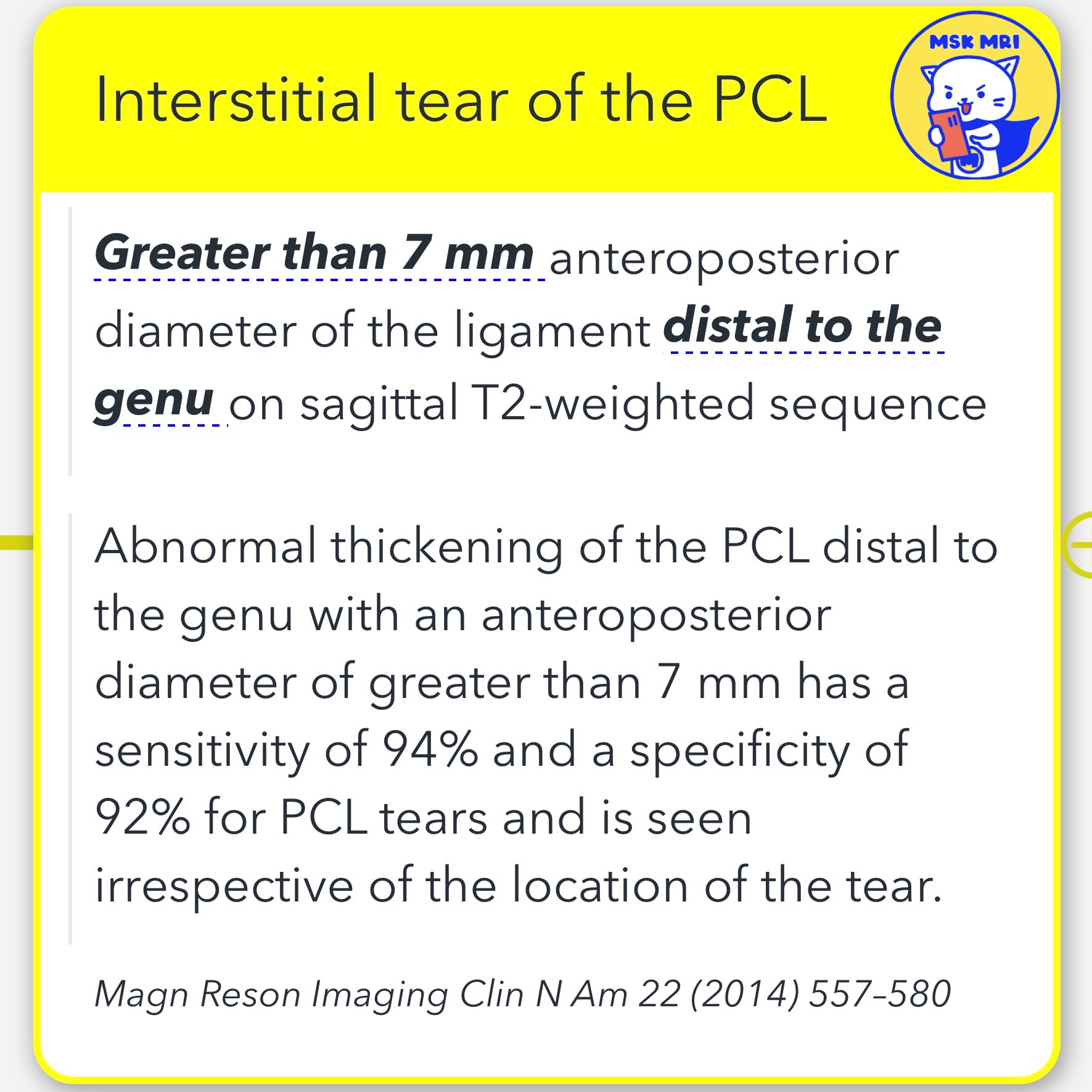 - Abnormal thickening of the PCL distal to the genu with an anteroposterior diameter greater than 7 mm has a 94% sensitivity and 92% specificity for PCL tears. This finding is consistent regardless of the tear's location.