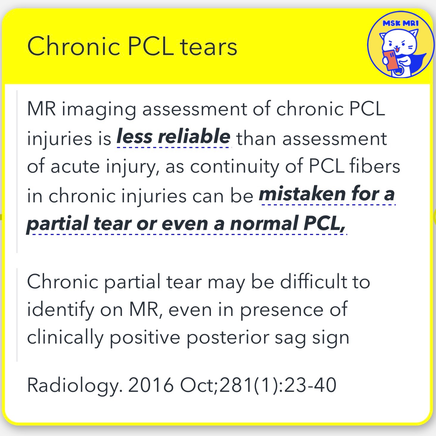 ✅MR imaging for chronic PCL injuries is less reliable, often confusing ligament continuity with partial or no tears. Identifying chronic partial tears is difficult, even with clinical indicators.