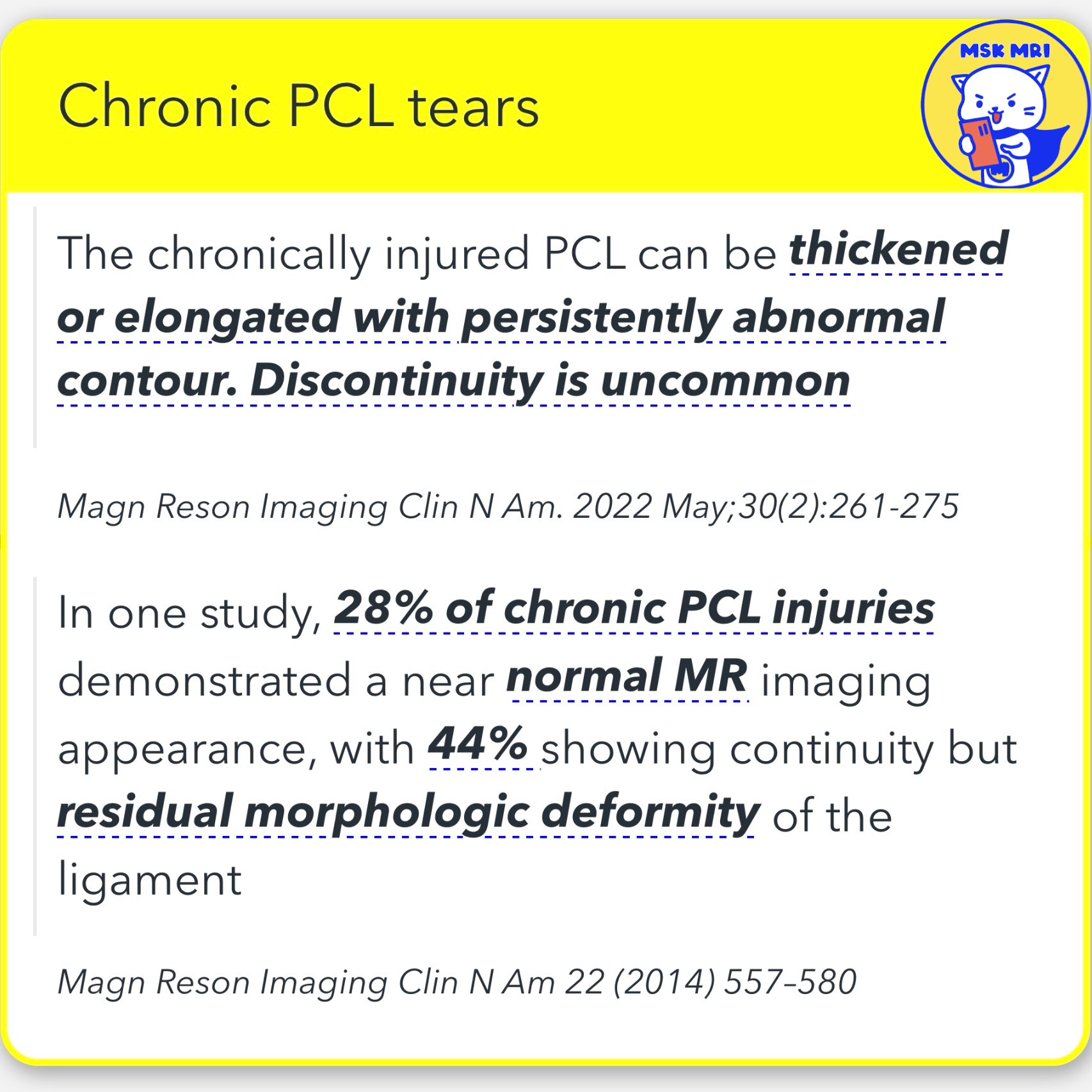 ✅ Chronic PCL damage may show ligament thickening or elongation, with abnormal shape but seldom discontinuity.