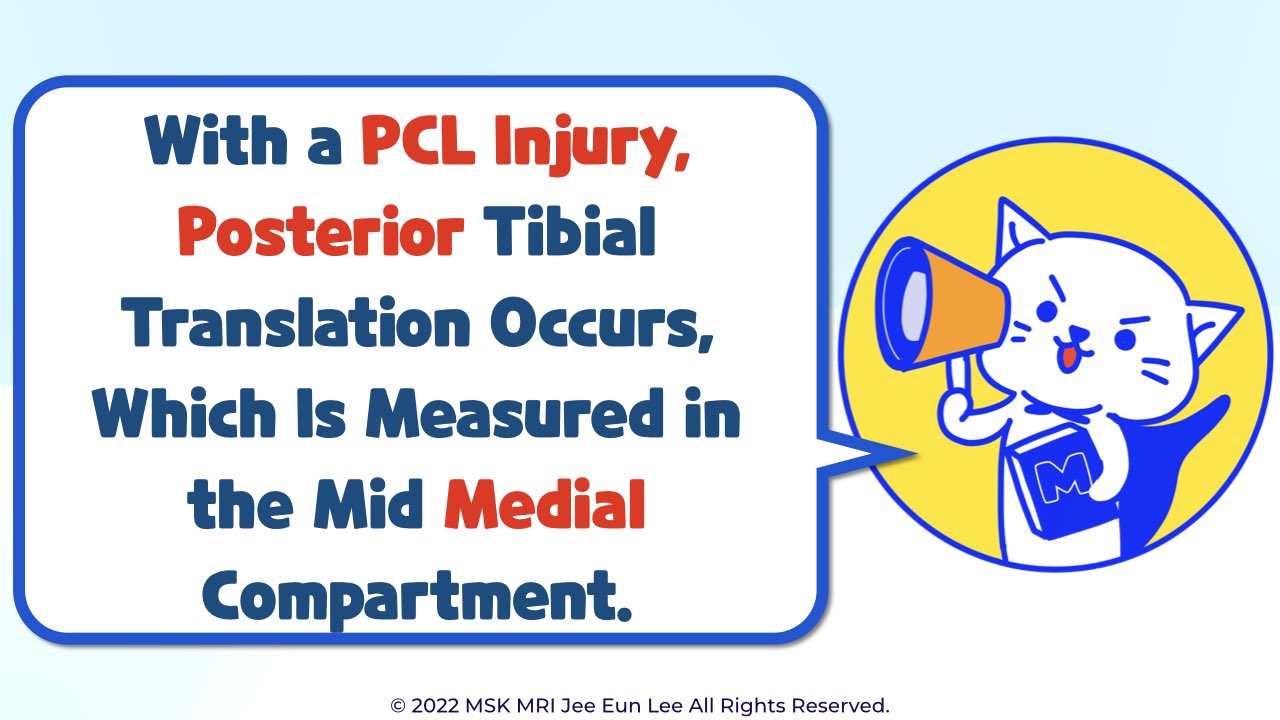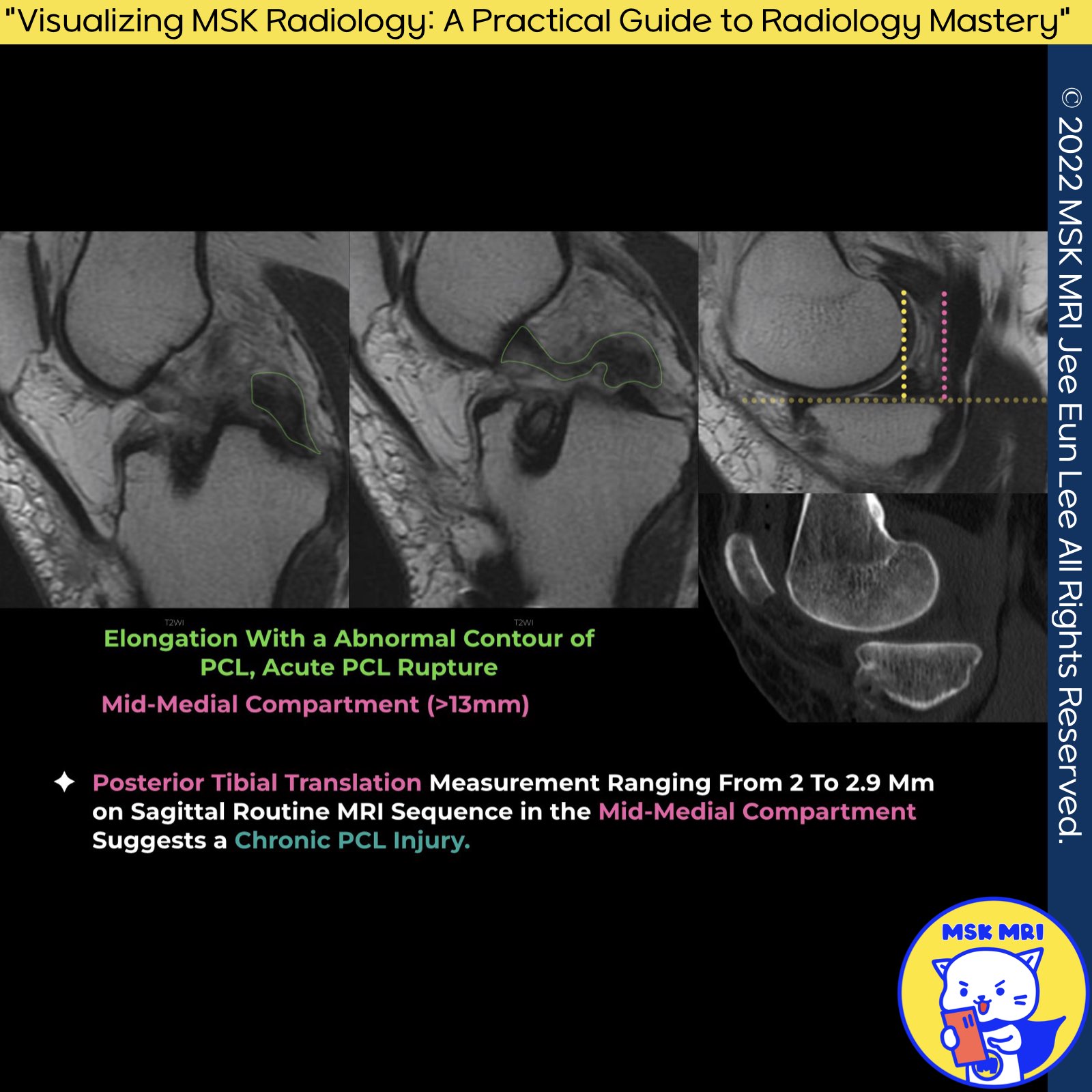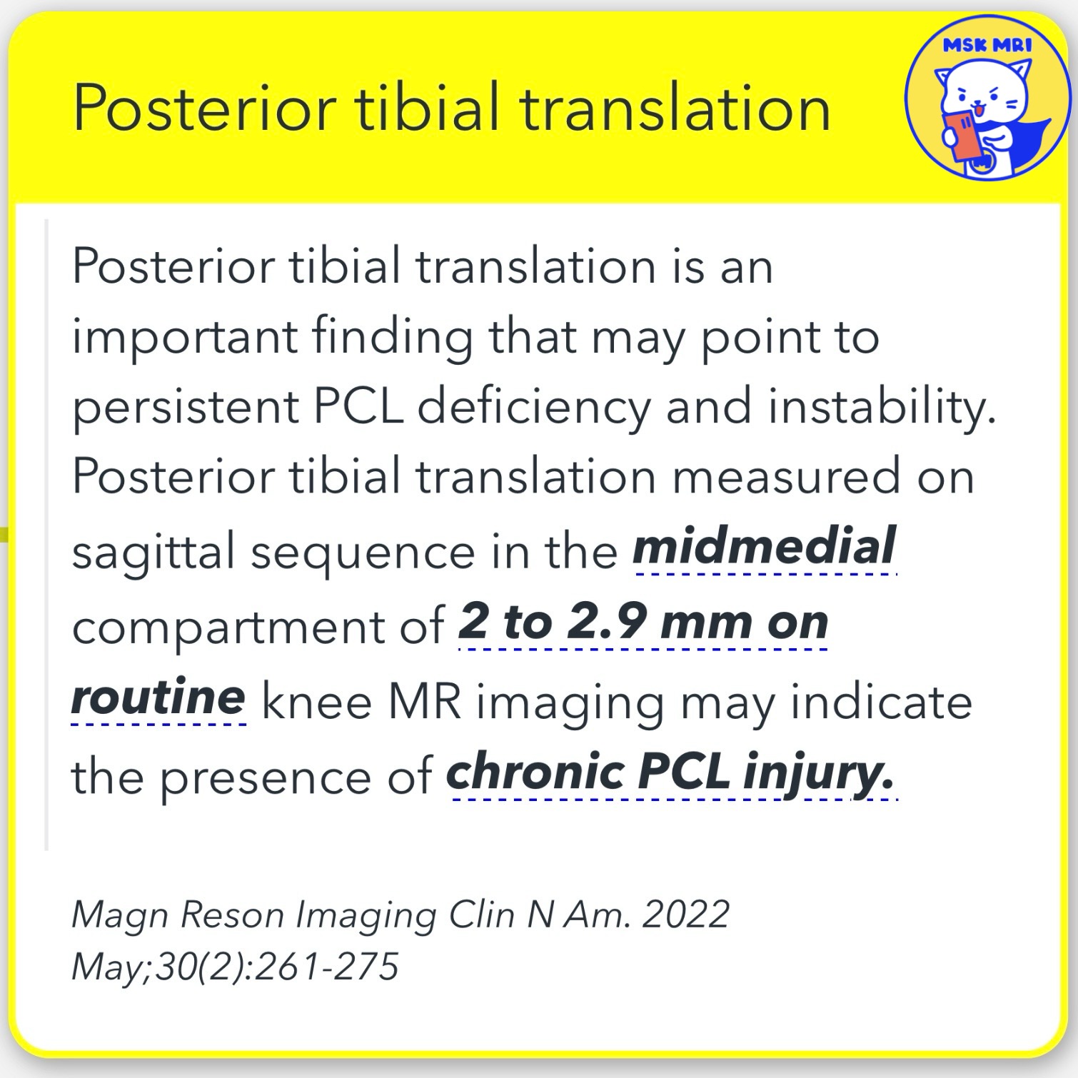 - Measurement Details: A posterior tibial translation of 2 to 2.9 mm measured on the sagittal sequence in the midmedial compartment, as seen on routine knee MR imaging, may suggest the presence of chronic PCL injury.