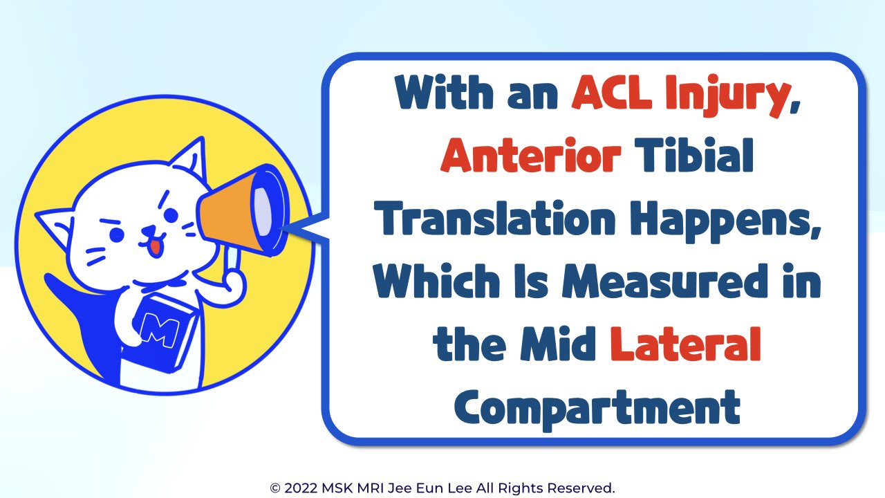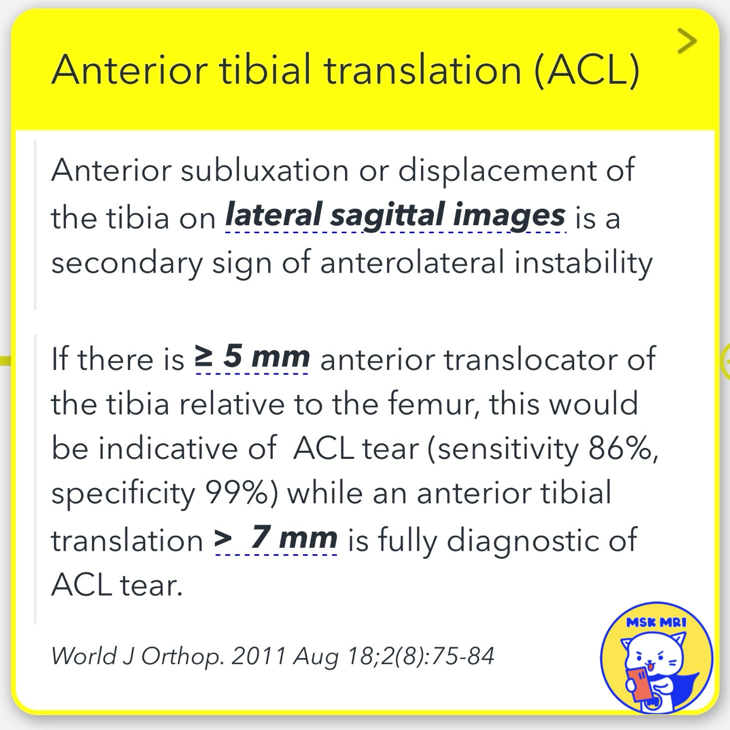 If there is ≥ 5 mm anterior translocator of the tibia relative to the femur, this would be indicative of ACL tear (sensitivity 86%, specificity 99%) while an anterior tibial translation > 7 mm is fully diagnostic of ACL tear.