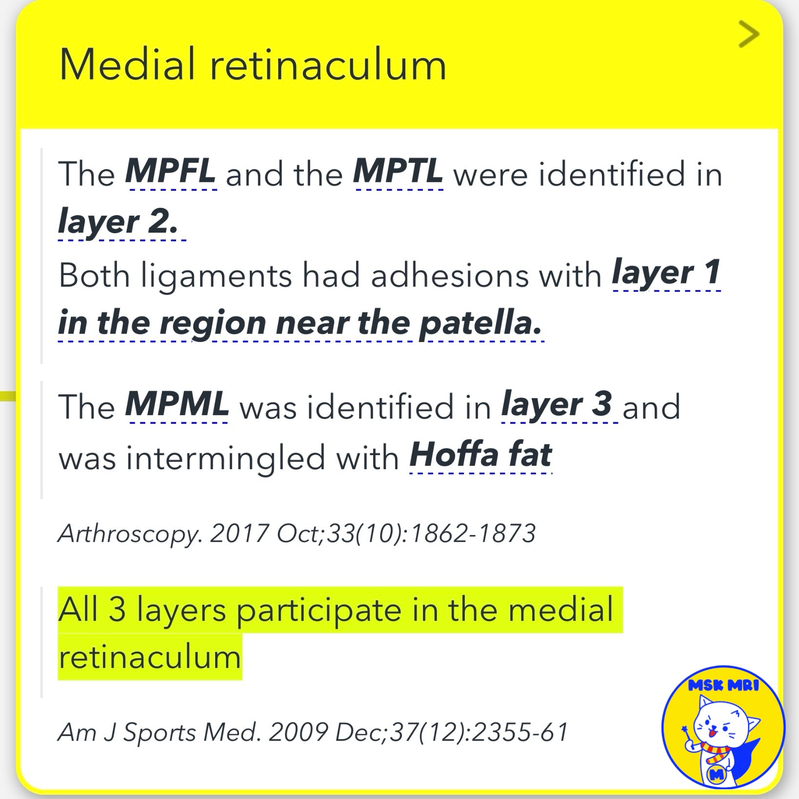 - The MPFL and MPTL are in layer 2, with adhesions to layer 1 near the patella.