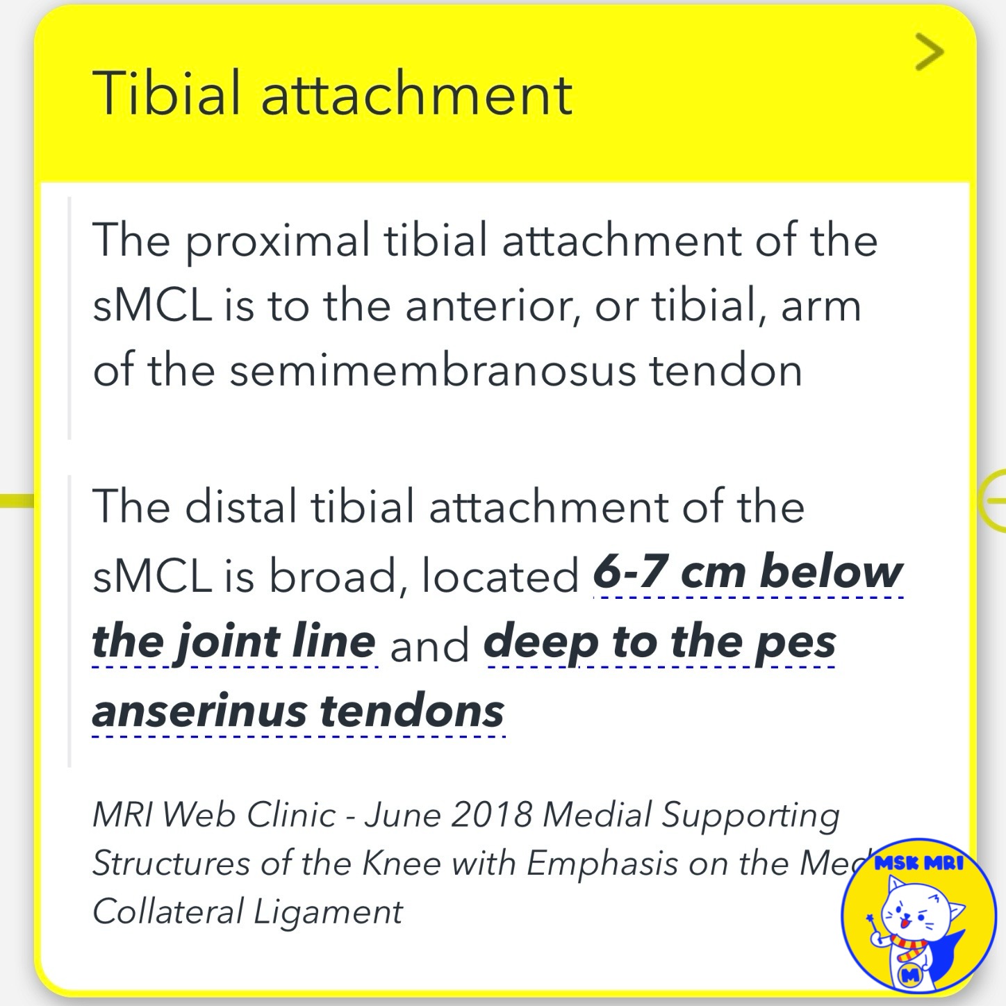 - Distal tibial attachment: Broad, 6-7 cm below joint line, deep to pes anserinus tendons