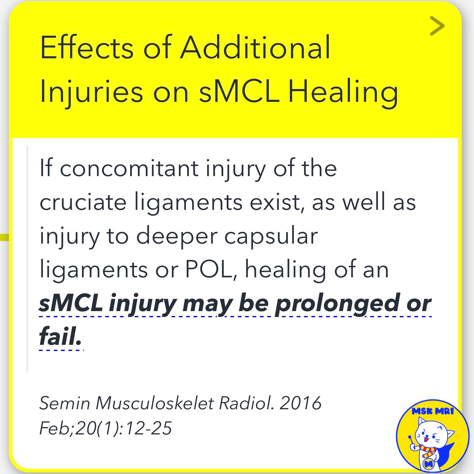 - If cruciate, deep capsular, or posteromedial corner injuries coexist, superficial MCL healing may fail