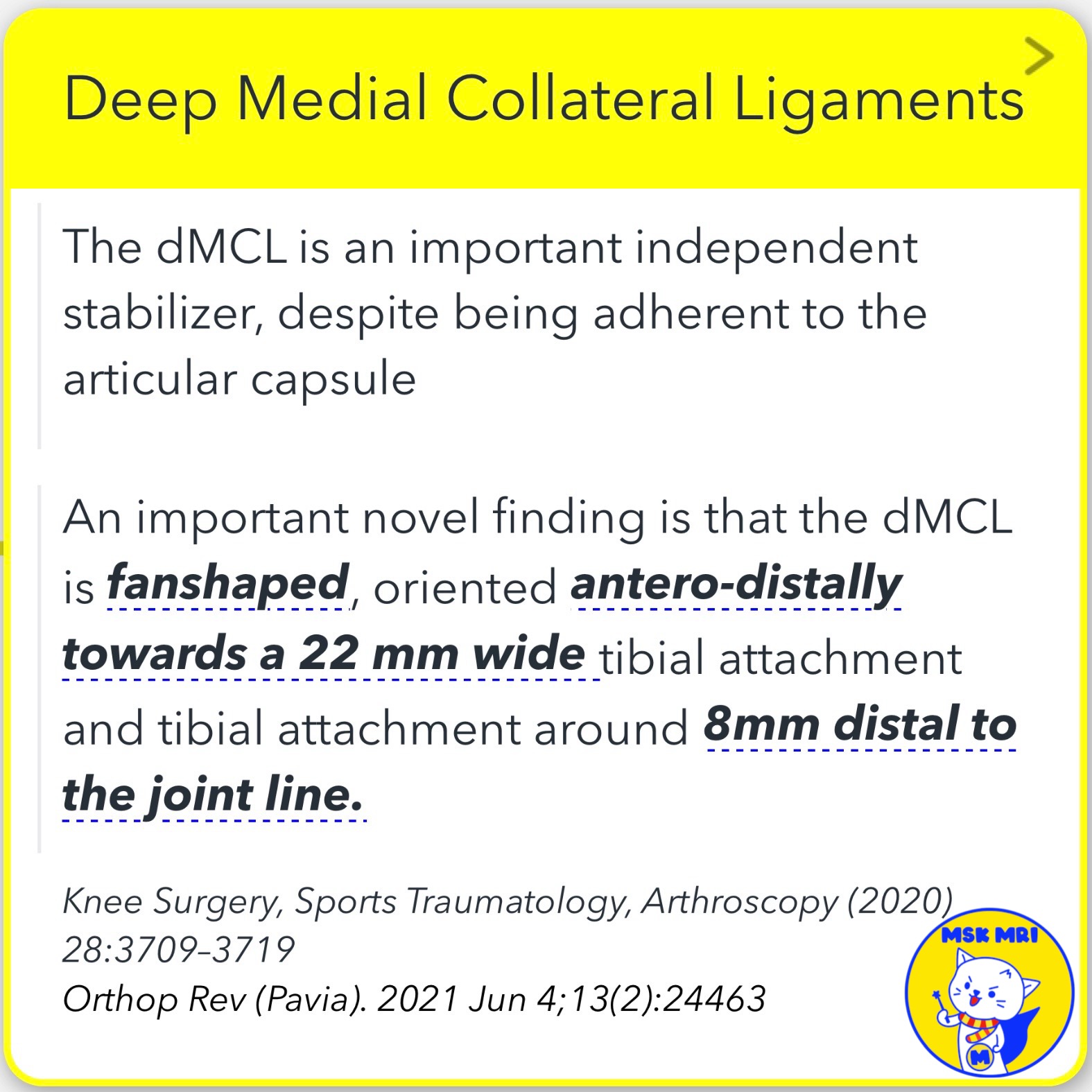 - Recent findings have revealed that the dMCL has a distinctive fan-shaped orientation, extending antero-distally towards a 22 mm wide tibial attachment located approximately 8 mm distal to the joint line.