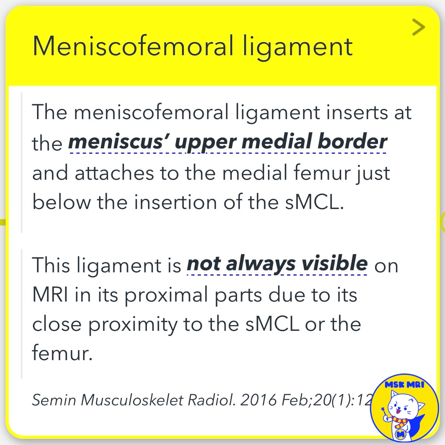 - May not be visible on MRI due to its proximity to the sMCL or femur