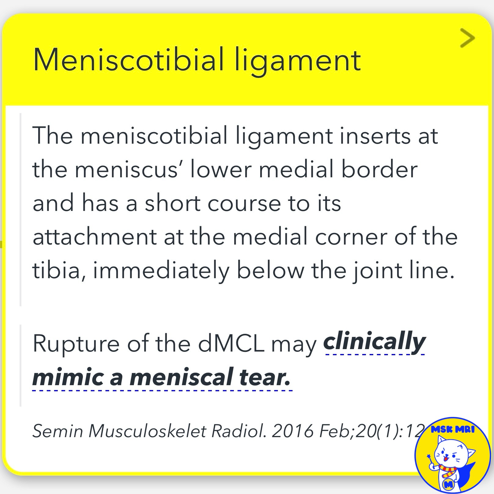 - Rupture of the dMCL can clinically mimic a meniscal tear, highlighting the importance of recognizing and properly evaluating this structure during knee examinations and imaging studies.
