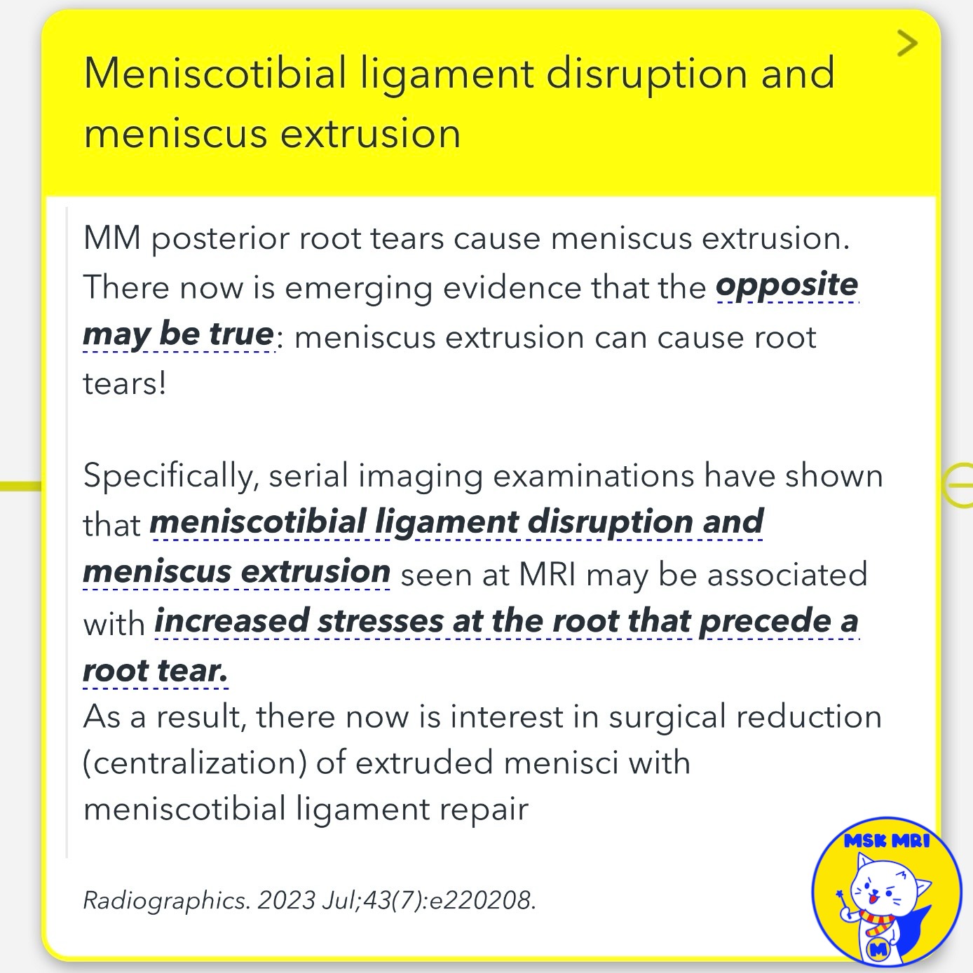 - Emerging evidence suggests that meniscus extrusion can also cause root tears, not just the other way around.