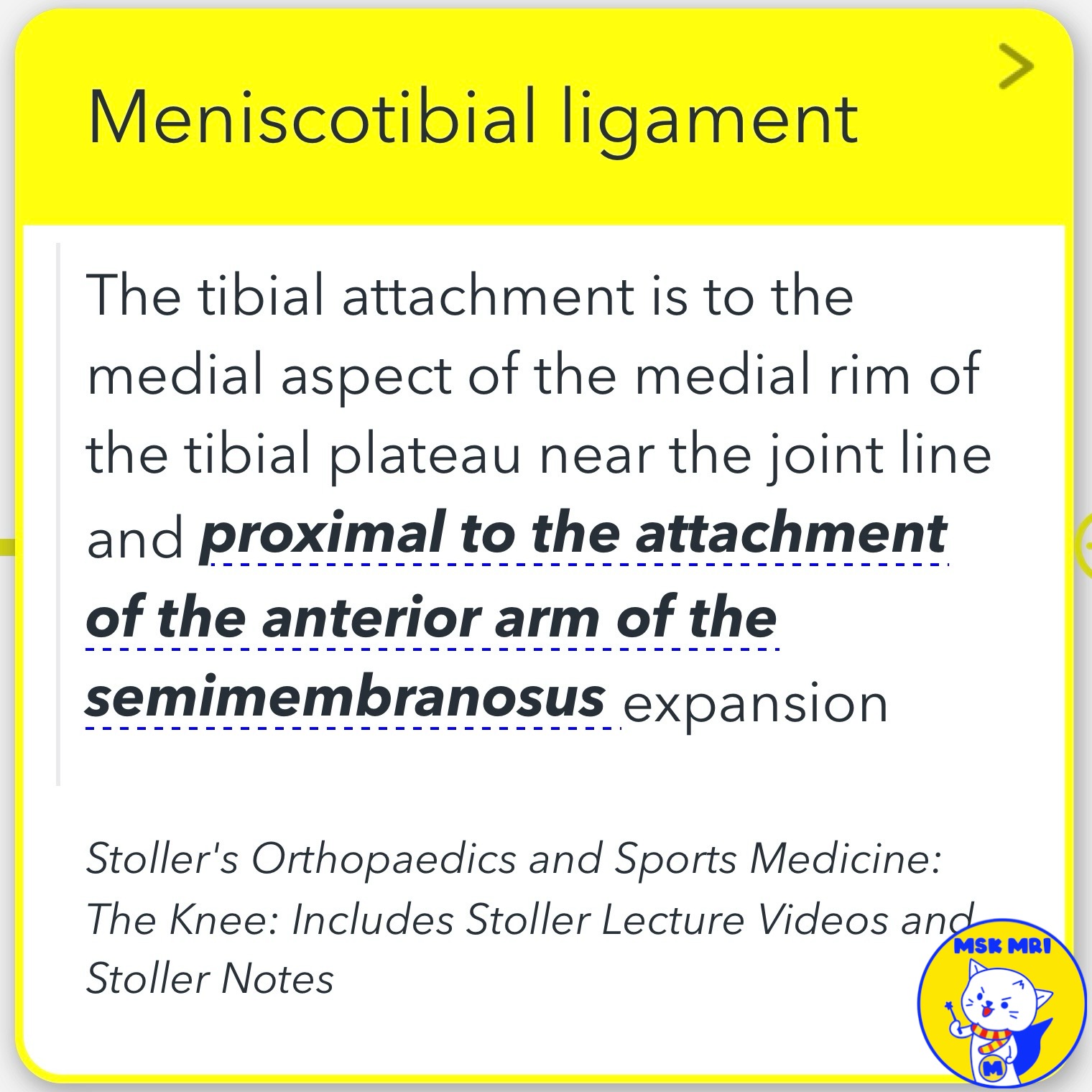 Its tibial attachment is located on the medial aspect of the medial rim of the tibial plateau, near the joint line and proximal to the attachment of the anterior arm of the semimembranosus expansion.