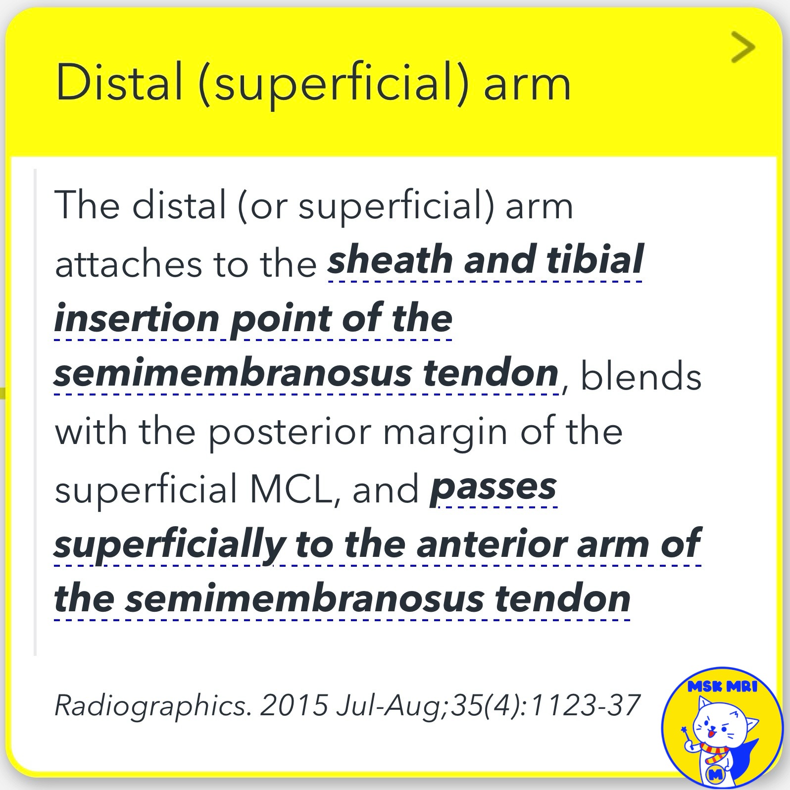 - Superficial arm - blends with superficial MCL and semimembranosus insertion