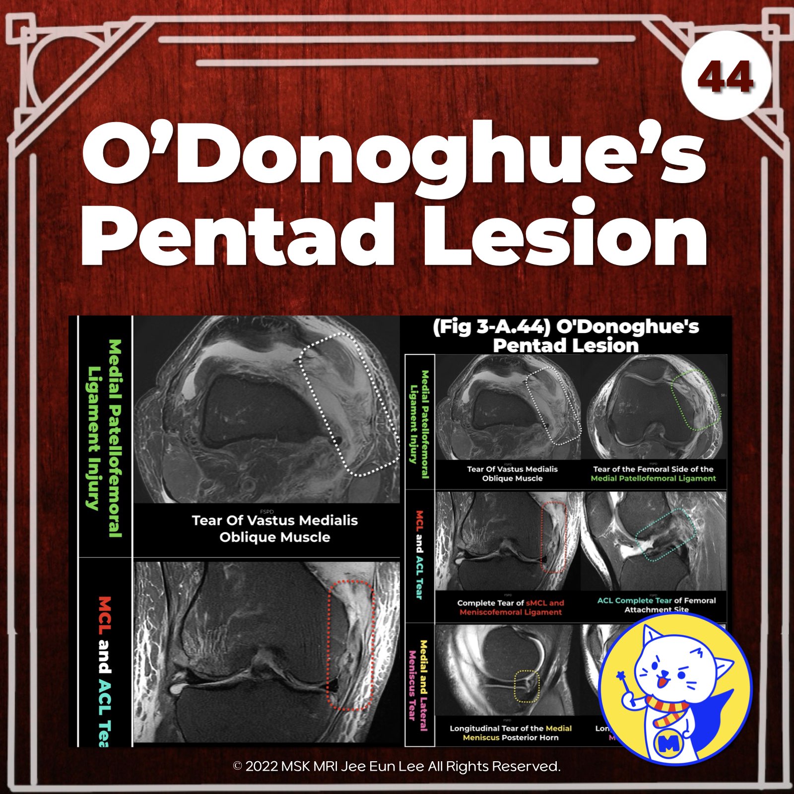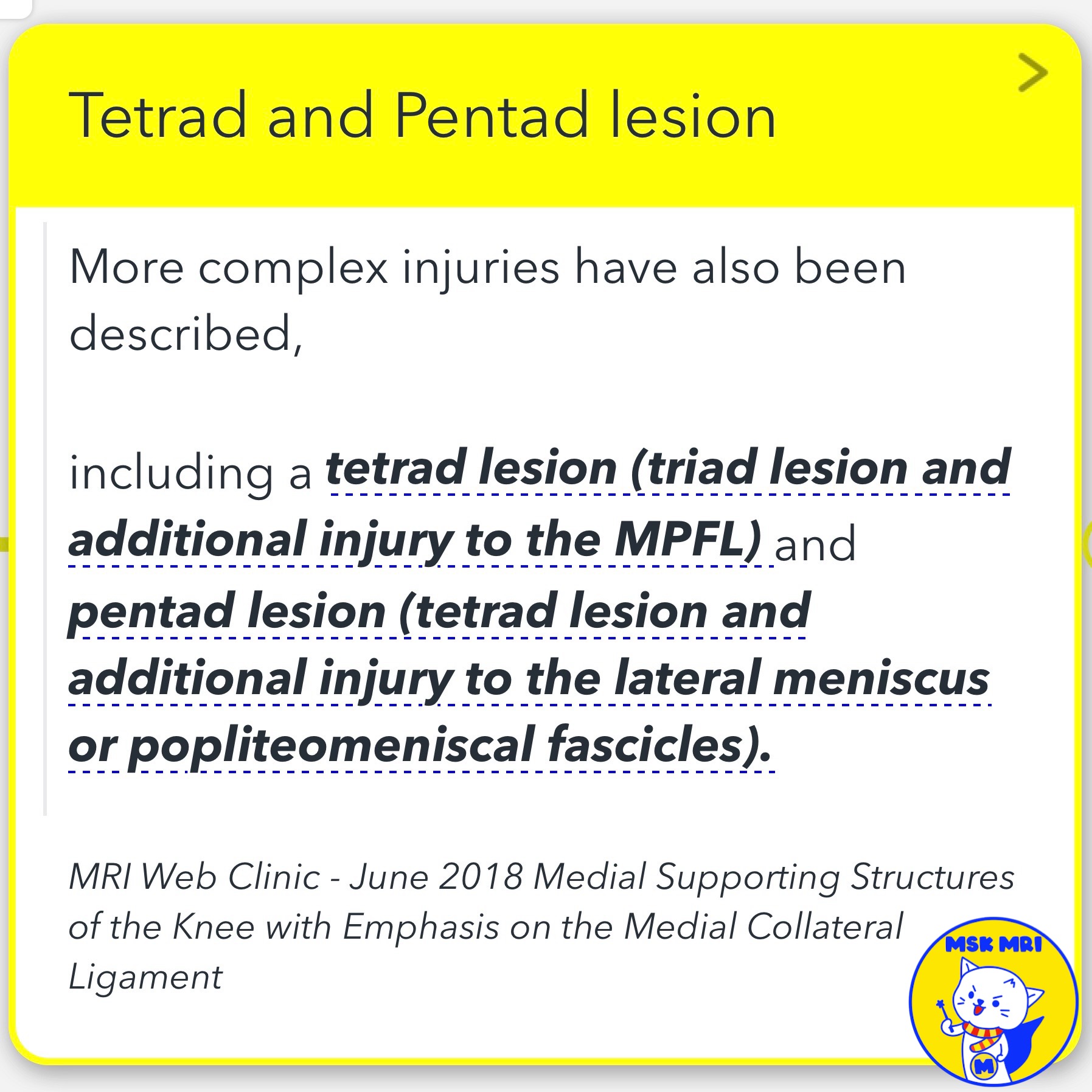 - Tetrad Lesion: When there is an additional injury to the Medial Patellofemoral Ligament (MPFL), the condition escalates to what is termed a tetrad lesion.