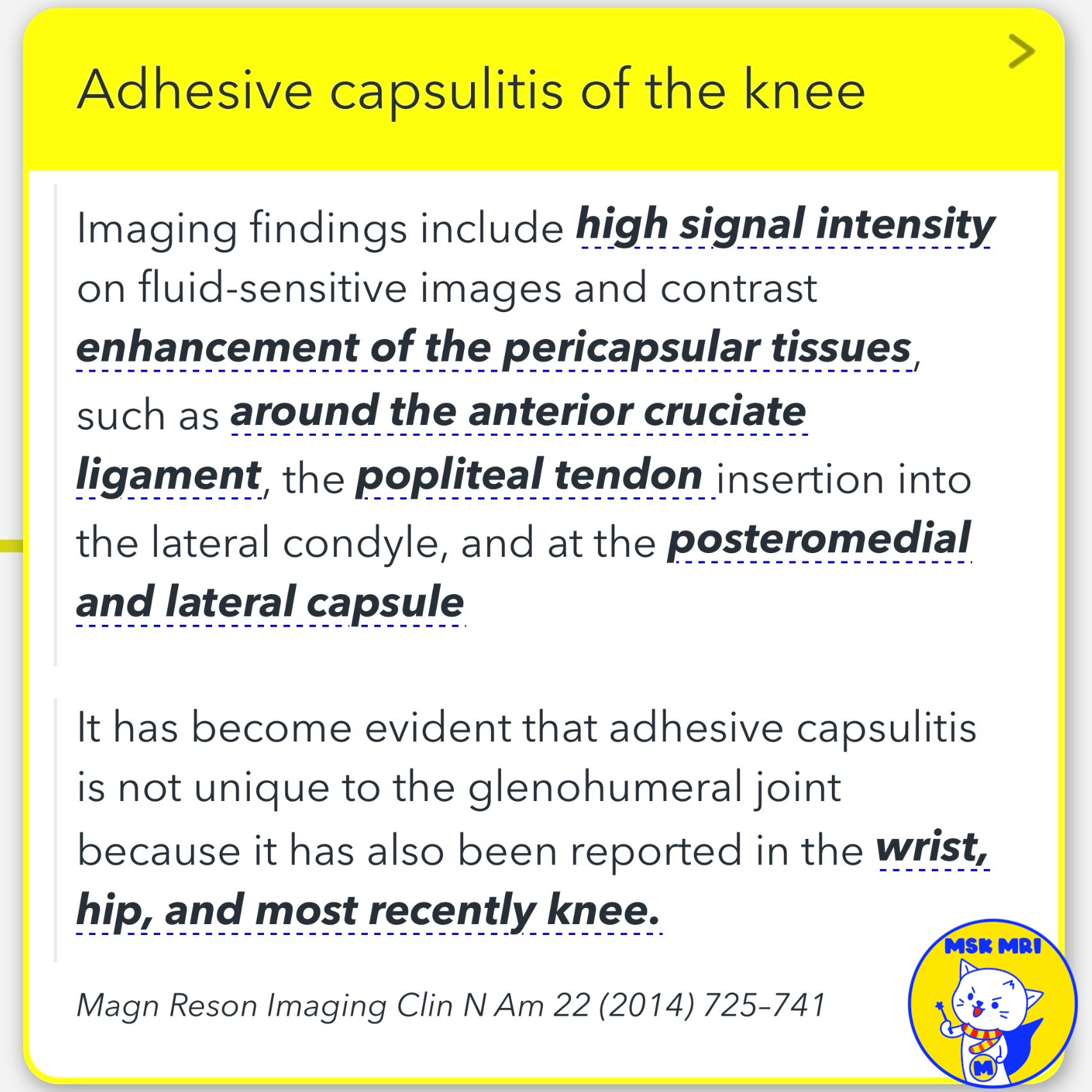 - De Abreu et al. reported a case of knee pain with high T2 signal diffusely along the ACL, suprapatellar fat pad, and posteromedial capsule. Fluorodeoxyglucose positron emission tomography/computed tomography revealed extensive enhancement of the same structures, as well as the posterior cruciate ligament (PCL), popliteus insertion, posterior capsule, and semimembranosus (SM) insertion.
