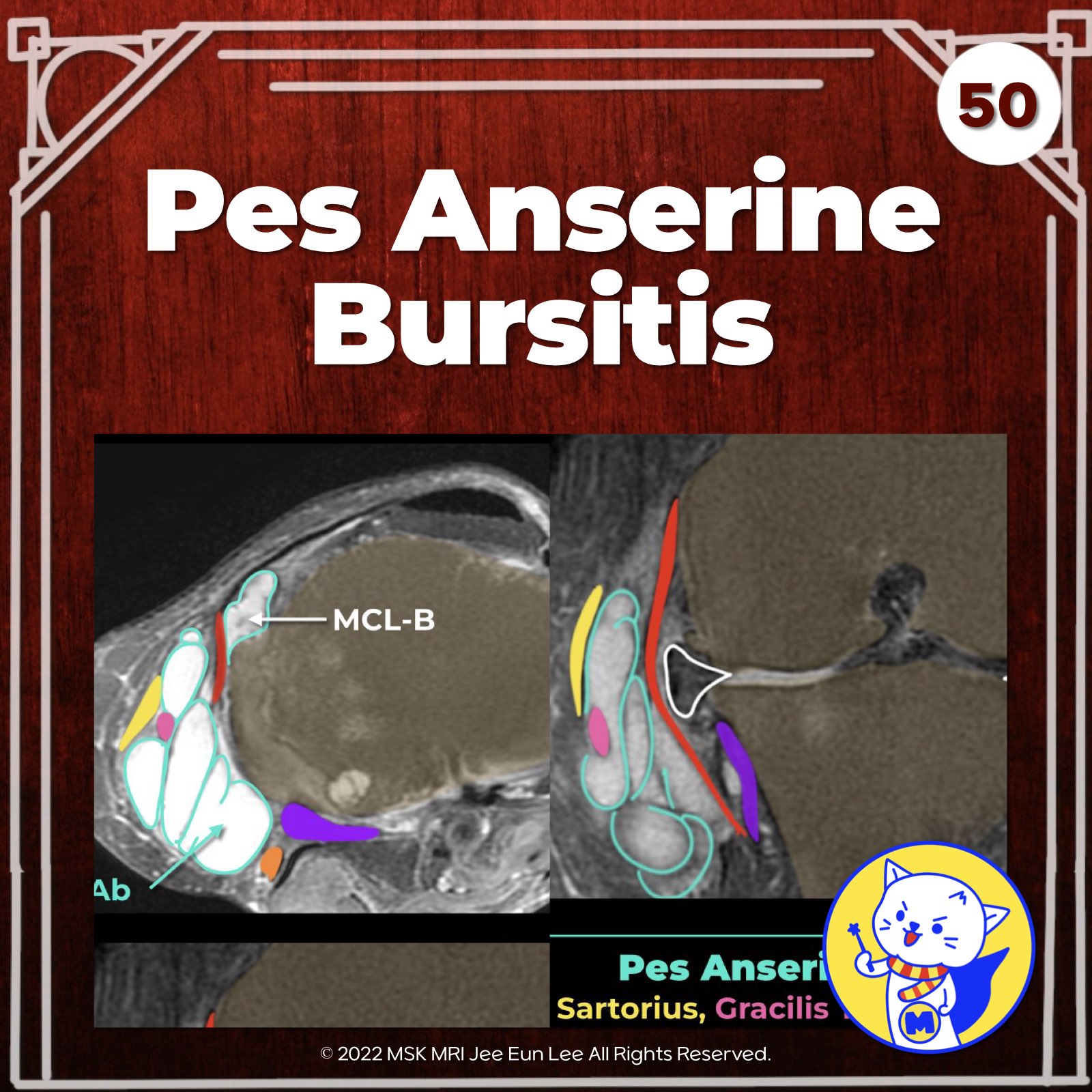 Pes anserinus bursitis refers to inflammation of the bursa located deep to the conjoined tendons (pes anserinus) on the medial aspect of the knee.