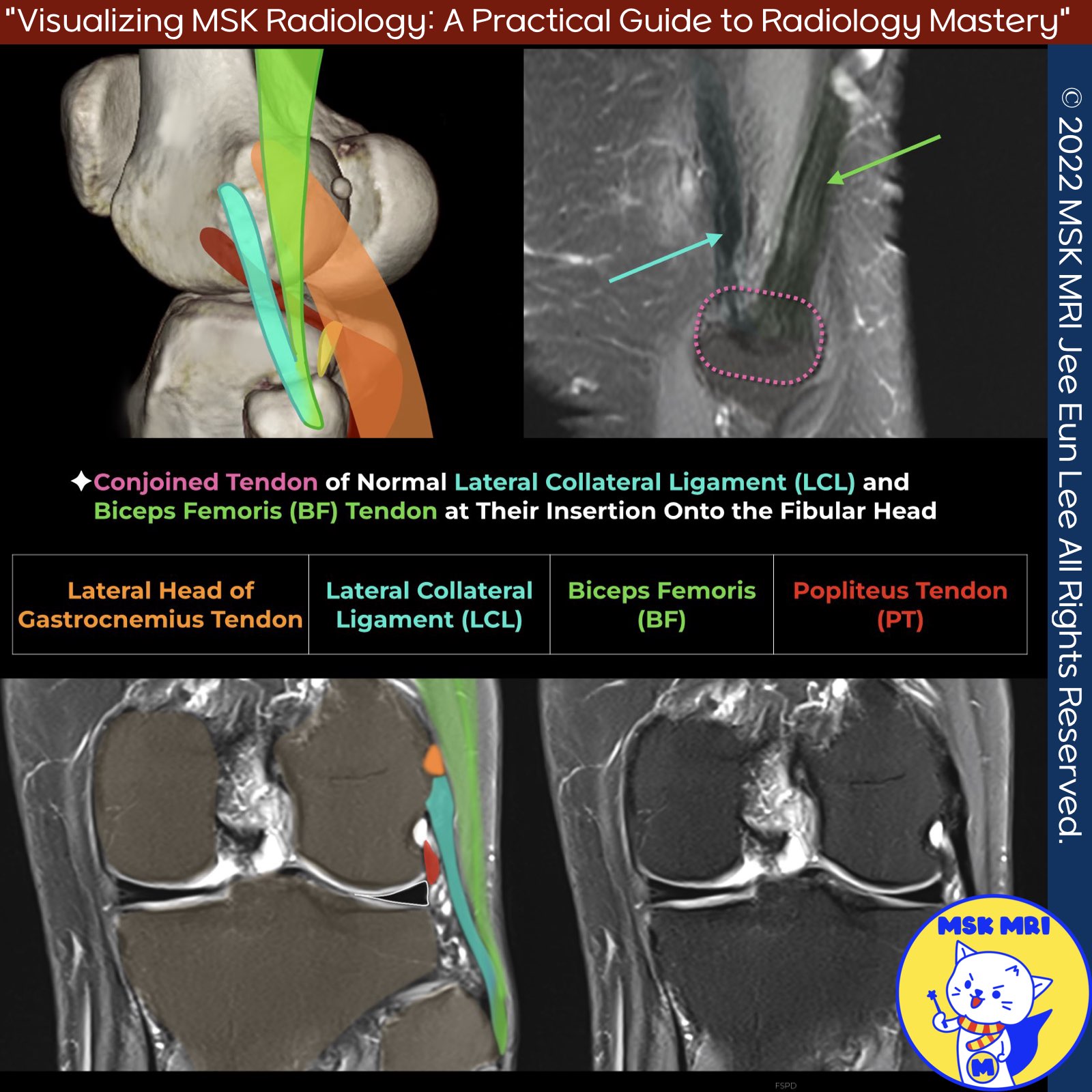 - Tendon The LCL and biceps femoris tendon blend into a conjoined tendon distally, inserting onto the fibular head.