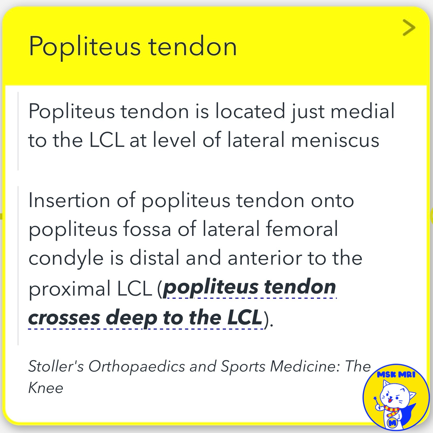 - The popliteus tendon attaches to the lateral femoral condyle anterior and distal to the LCL femoral origin.