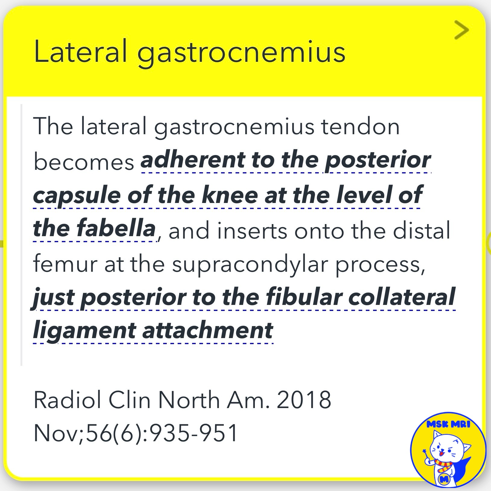 - The lateral gastrocnemius tendon becomes adherent to the posterior knee capsule at the fabella level, inserting on the distal femur at the supracondylar process, just posterior to the LCL femoral attachment.