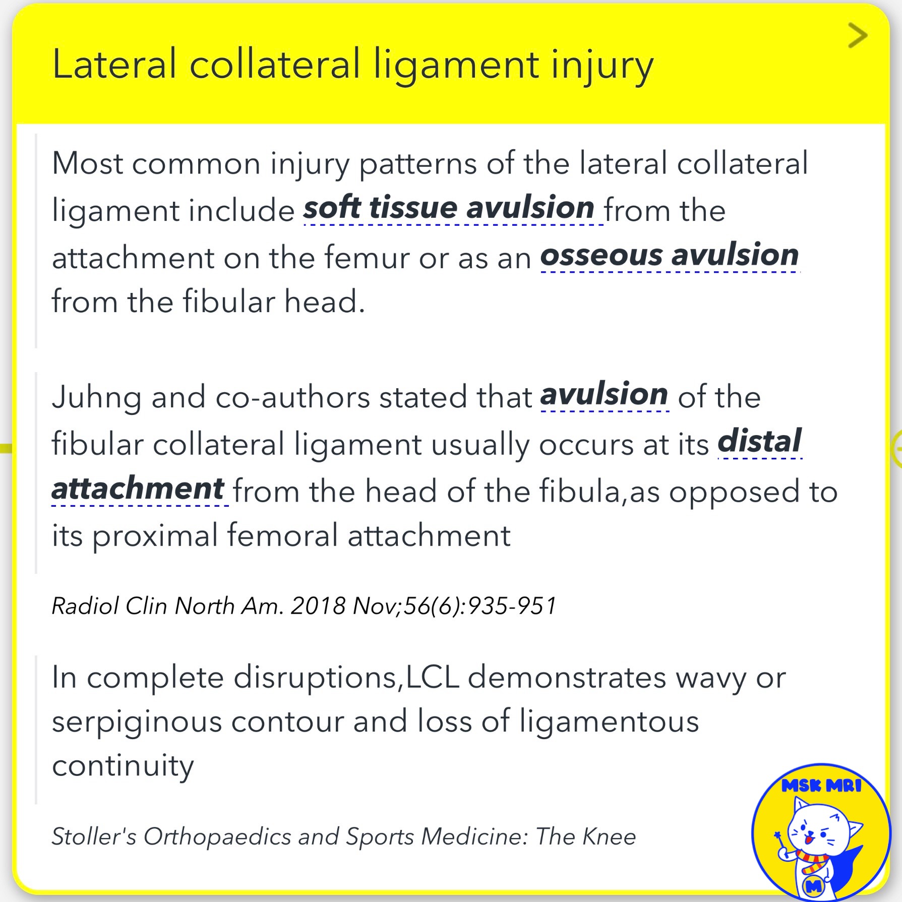 - According to Juhng et al., avulsion of the LCL usually occurs at its distal attachment from the head of the fibula, rather than its proximal femoral attachment.