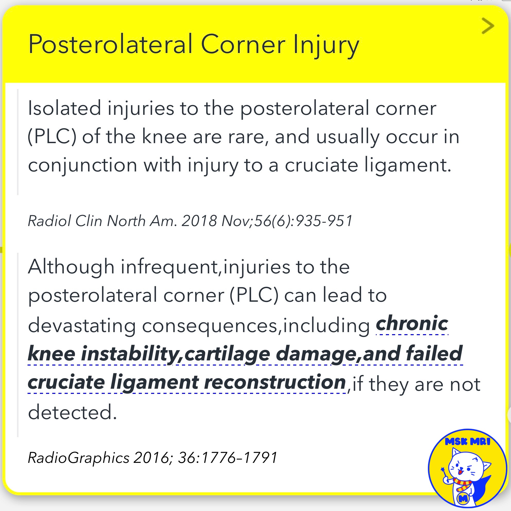 - PLC injuries usually occur in conjunction with injury to a cruciate ligament (ACL or PCL).