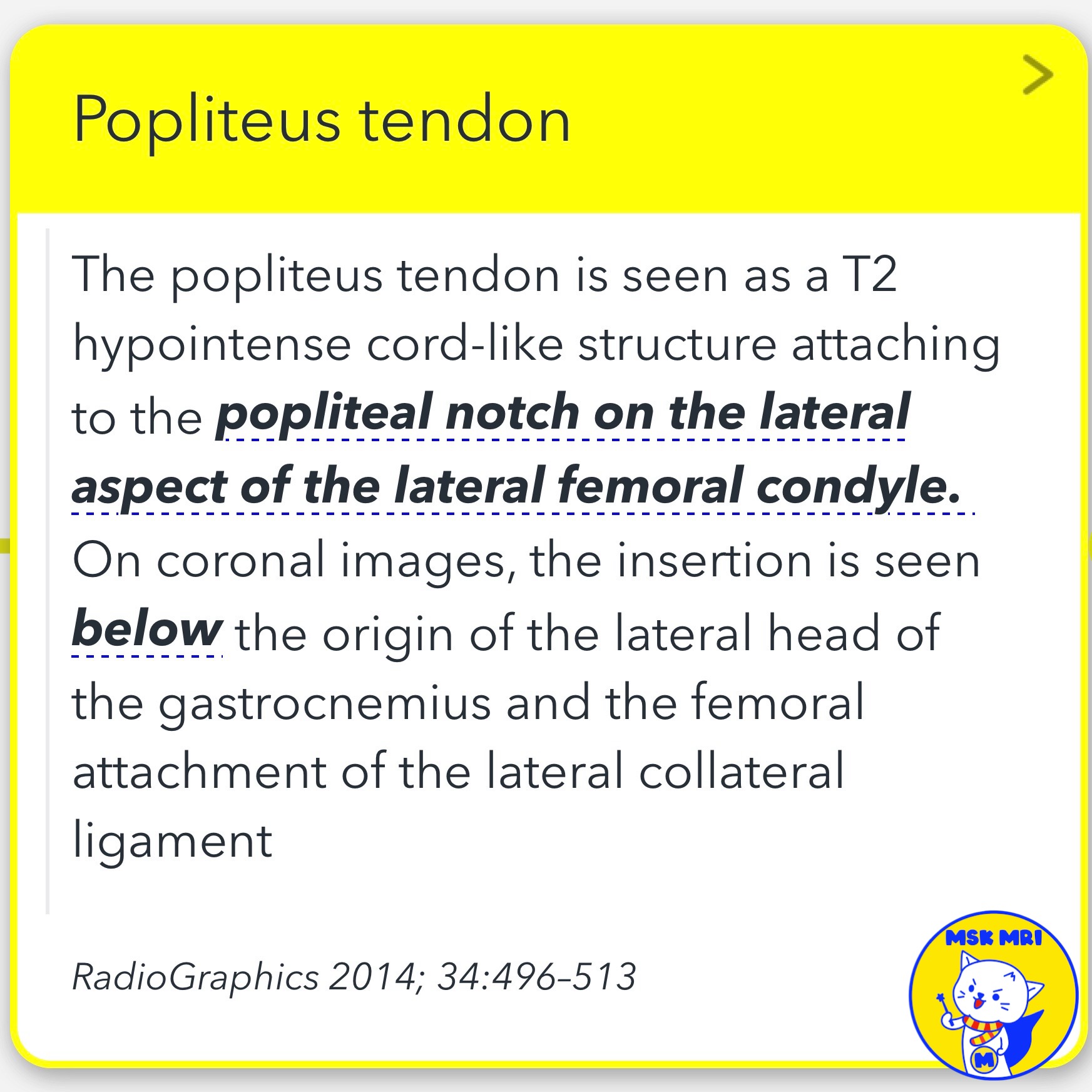 - Popliteus tendon tears can be intra-articular at the level of the popliteal hiatus and at or near the femoral attachment.