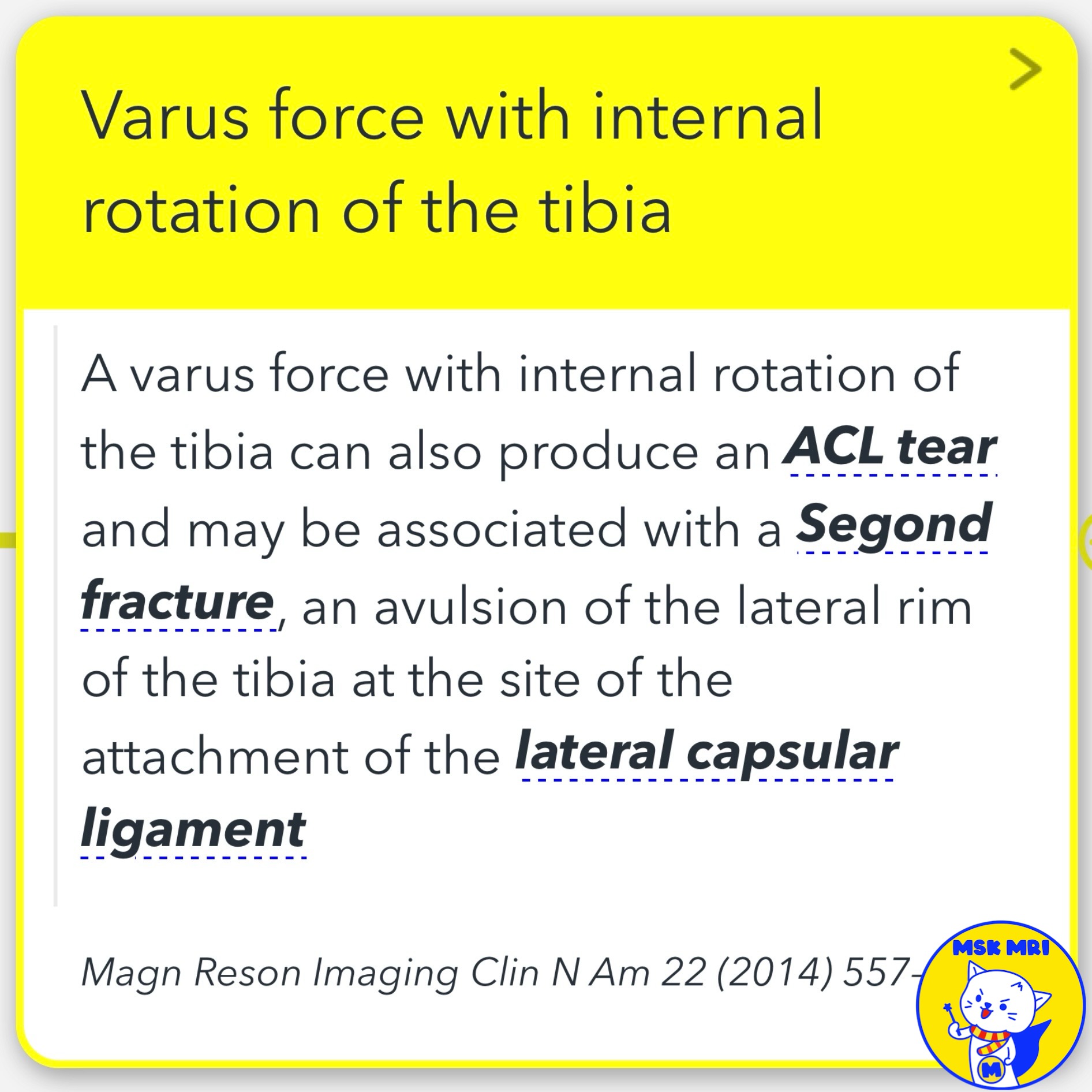 - It may be linked to a Segond fracture (avulsion of the lateral tibial rim where the lateral capsular ligament attaches)